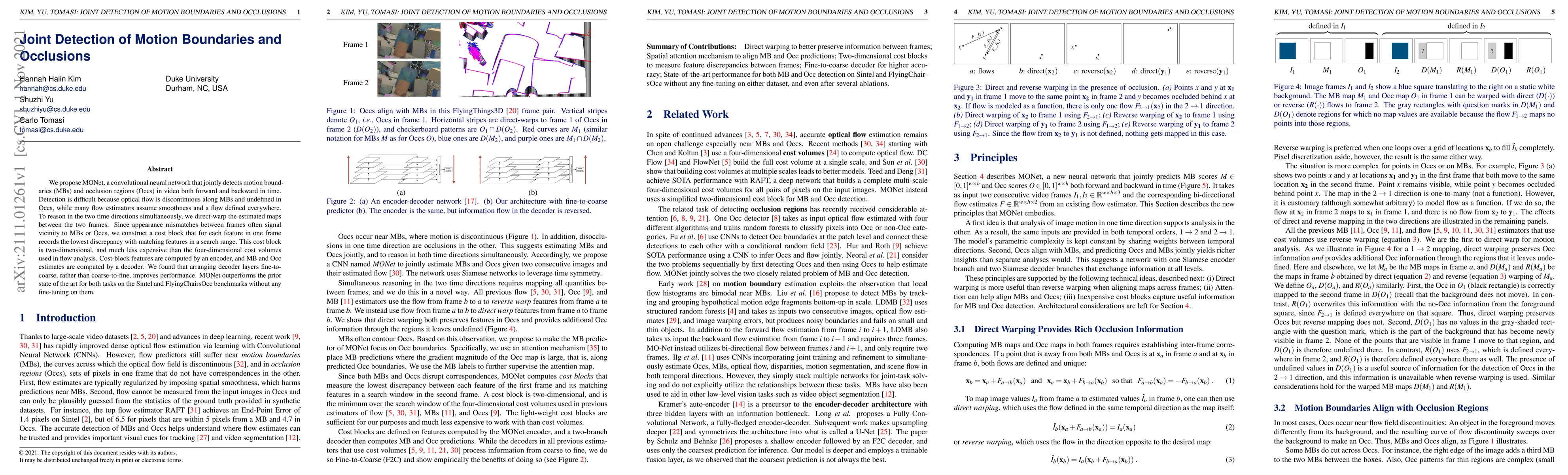 We propose MONet, a convolutional neural network that jointly detects motion boundaries (MBs) and occlusion regions (Occs) in video both forward and backward in time. Detection is difficult because optical flow is discontinuous along MBs and undefined in Occs, while many flow estimators assume smoothness and a flow defined everywhere. To reason in the two time directions simultaneously, we direct-warp the estimated maps between the two frames. Since appearance mismatches between frames often signal vicinity to MBs or Occs, we construct a cost block that for each feature in one frame records the lowest discrepancy with matching features in a search range. This cost block is two-dimensional, and much less expensive than the four-dimensional cost volumes used in flow analysis. Cost-block features are computed by an encoder, and MB and Occ estimates are computed by a decoder. We found that arranging decoder layers fine-to-coarse, rather than coarse-to-fine, improves performance. MONet outperforms the prior state of the art for both tasks on the Sintel and FlyingChairsOcc benchmarks without any fine-tuning on them.