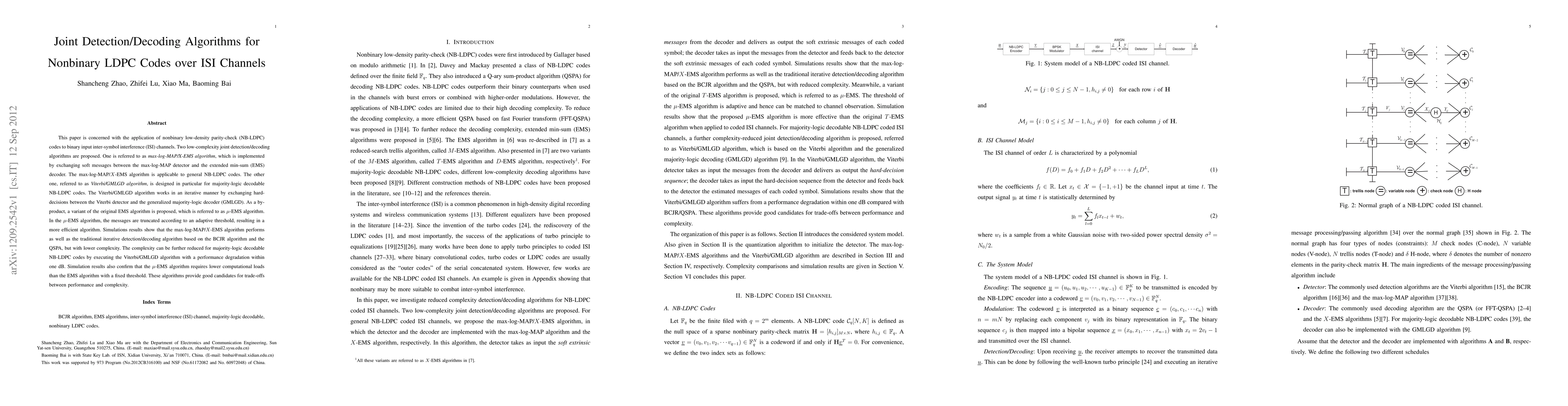 This paper proposes two low-complexity joint detection/decoding algorithms for nonbinary LDPC codes over ISI channels: the max-log-MAP/X-EMS algorithm and the Viterbi/GMLGD algorithm. The former performs well with general NB-LDPC codes, while the latter is optimized for majority-logic decodable codes, achieving similar performance with lower complexity.