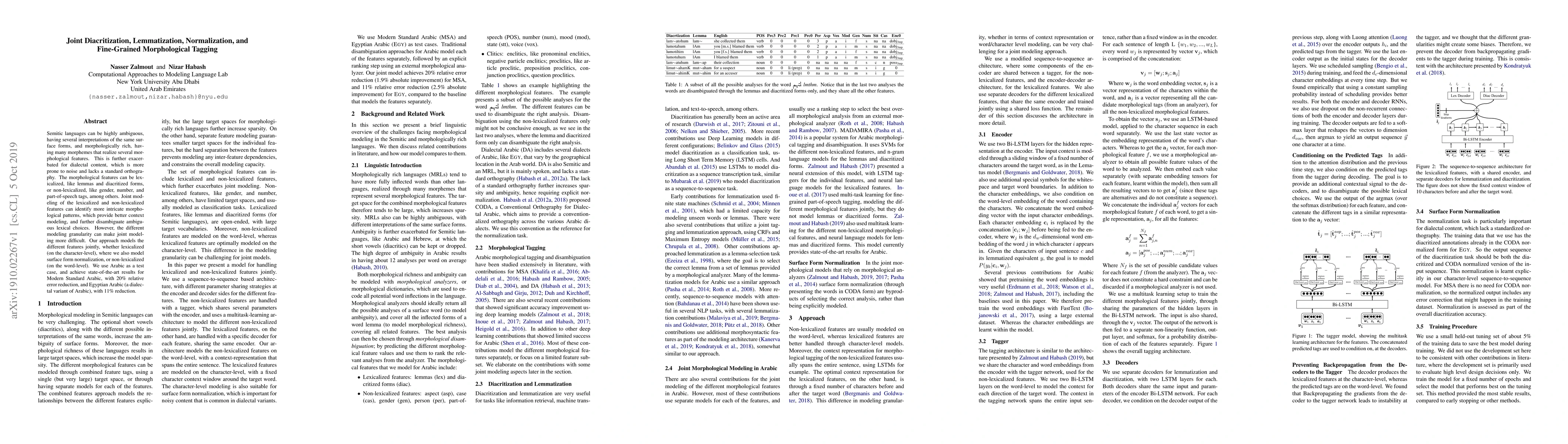 Semitic languages can be highly ambiguous, having several interpretations of the same surface forms, and morphologically rich, having many morphemes that realize several morphological features. This is further exacerbated for dialectal content, which is more prone to noise and lacks a standard orthography. The morphological features can be lexicalized, like lemmas and diacritized forms, or non-lexicalized, like gender, number, and part-of-speech tags, among others. Joint modeling of the lexicalized and non-lexicalized features can identify more intricate morphological patterns, which provide better context modeling, and further disambiguate ambiguous lexical choices. However, the different modeling granularity can make joint modeling more difficult. Our approach models the different features jointly, whether lexicalized (on the character-level), where we also model surface form normalization, or non-lexicalized (on the word-level). We use Arabic as a test case, and achieve state-of-the-art results for Modern Standard Arabic, with 20% relative error reduction, and Egyptian Arabic (a dialectal variant of Arabic), with 11% reduction.