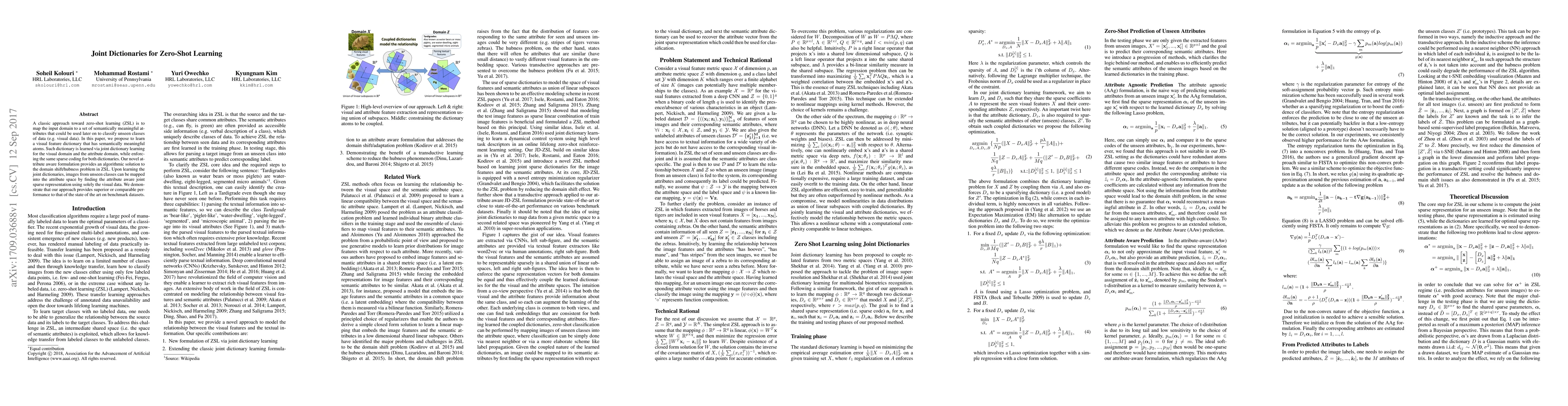 This paper proposes a method for zero-shot learning by learning joint visual and attribute dictionaries that enforce the same sparse coding, addressing the domain shift/hubness problem. The approach enables classification of unseen classes by mapping images to the attribute space using the learned joint dictionaries.
