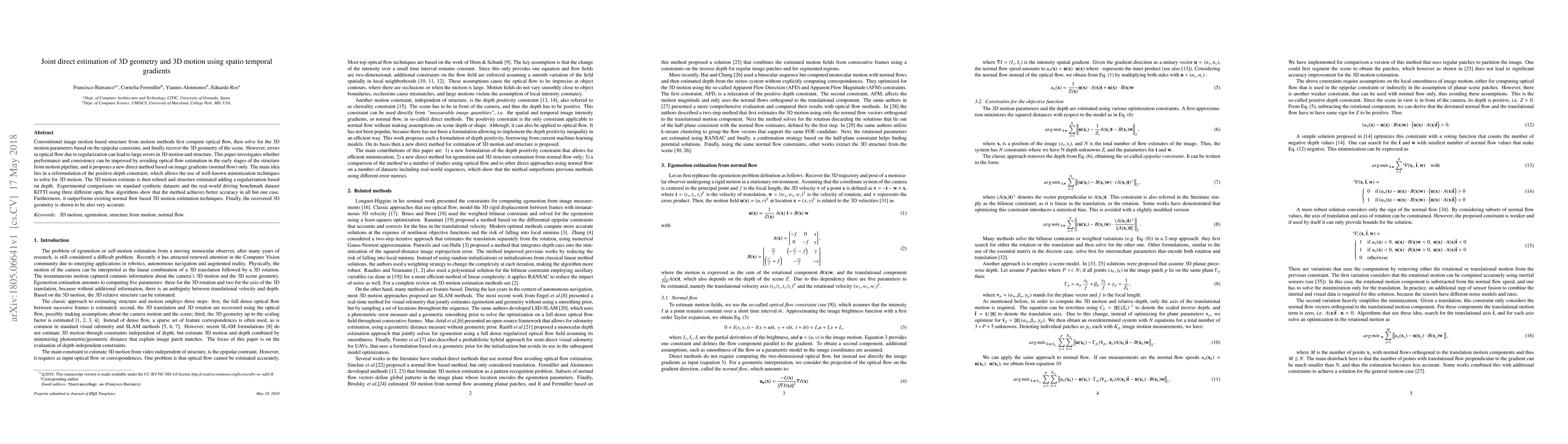 Conventional image motion based structure from motion methods first compute optical flow, then solve for the 3D motion parameters based on the epipolar constraint, and finally recover the 3D geometry of the scene. However, errors in optical flow due to regularization can lead to large errors in 3D motion and structure. This paper investigates whether performance and consistency can be improved by avoiding optical flow estimation in the early stages of the structure from motion pipeline, and it proposes a new direct method based on image gradients (normal flow) only. The main idea lies in a reformulation of the positive-depth constraint, which allows the use of well-known minimization techniques to solve for 3D motion. The 3D motion estimate is then refined and structure estimated adding a regularization based on depth. Experimental comparisons on standard synthetic datasets and the real-world driving benchmark dataset KITTI using three different optic flow algorithms show that the method achieves better accuracy in all but one case. Furthermore, it outperforms existing normal flow based 3D motion estimation techniques. Finally, the recovered 3D geometry is shown to be also very accurate.