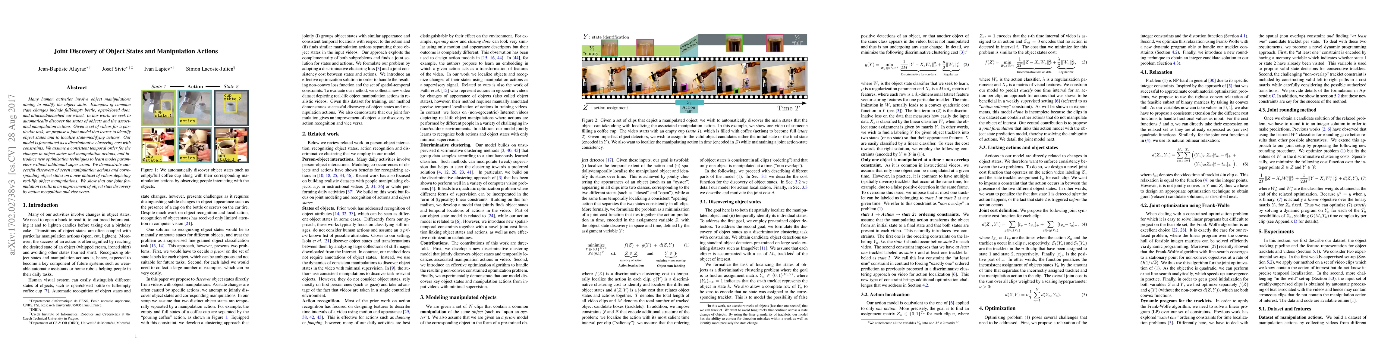 This paper proposes a joint model to automatically discover object states and associated manipulation actions from videos, using a discriminative clustering cost with constraints. The model improves both object state identification and action recognition through a consistent temporal order and new optimization techniques, achieving successful results on a new dataset.