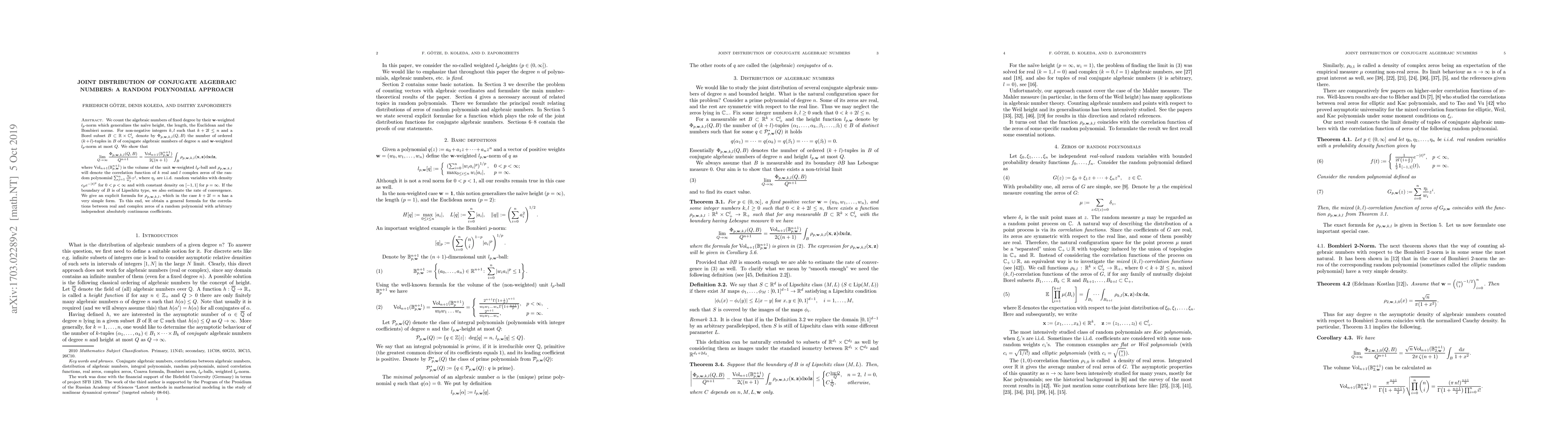 We count the algebraic numbers of fixed degree by their $\mathbf{w}$-weighted $l_p$-norm which generalizes the na\"ive height, the length, the Euclidean and the Bombieri norms. For non-negative integers $k,l$ such that $k+2l\leq n$ and a Borel subset $B\subset \mathbb{R}\times\mathbb{C}_+^l$ denote by $\Phi_{p,\mathbf{w},k,l}(Q,B)$ the number of ordered $(k+l)$-tuples in $B$ of conjugate algebraic numbers of degree $n$ and $\mathbf{w}$-weighted $l_p$-norm at most $ Q$. We show that $$ \lim_{ Q\to\infty}\frac{\Phi_{p,\mathbf{w},k,l}( Q,B)}{ Q^{n+1}}=\frac{{\mathrm{Vol}}_{n+1}(\mathbb{B}_{p,\mathbf{w}}^{n+1})}{2\zeta(n+1)}\int_B \rho_{p,\mathbf{w},k,l}(\mathbf{x},\mathbf{z}){\rm d}\mathbf{x}{\rm d}\mathbf{z}, $$ where ${\mathrm{Vol}}_{n+1}(\mathbb{B}_{p,\mathbf{w}}^{n+1})$ is the volume of the unit $\mathbf{w}$-weighted $l_p$-ball and $\rho_{p,\mathbf{w},k,l}$ will denote the correlation function of $k$ real and $l$ complex zeros of the random polynomial $\sum_{j=1}^n \frac{\eta_j}{w_j} z^j$, where $\eta_j $ are i.i.d. random variables with density $c_p e^{-|t|^p}$ for $0