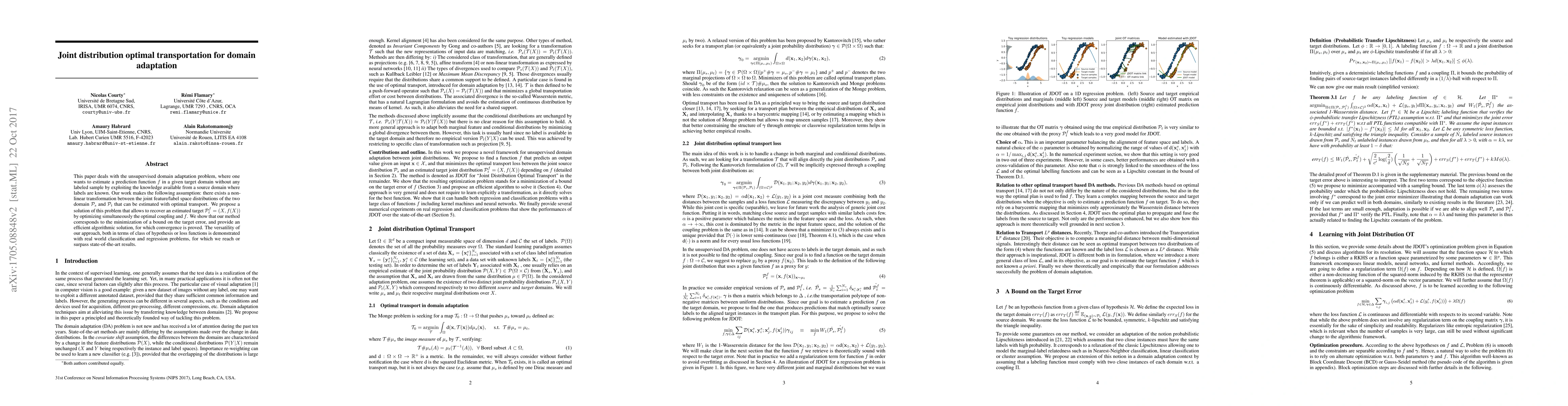 This paper deals with the unsupervised domain adaptation problem, where one wants to estimate a prediction function $f$ in a given target domain without any labeled sample by exploiting the knowledge available from a source domain where labels are known. Our work makes the following assumption: there exists a non-linear transformation between the joint feature/label space distributions of the two domain $\mathcal{P}_s$ and $\mathcal{P}_t$. We propose a solution of this problem with optimal transport, that allows to recover an estimated target $\mathcal{P}^f_t=(X,f(X))$ by optimizing simultaneously the optimal coupling and $f$. We show that our method corresponds to the minimization of a bound on the target error, and provide an efficient algorithmic solution, for which convergence is proved. The versatility of our approach, both in terms of class of hypothesis or loss functions is demonstrated with real world classification and regression problems, for which we reach or surpass state-of-the-art results.