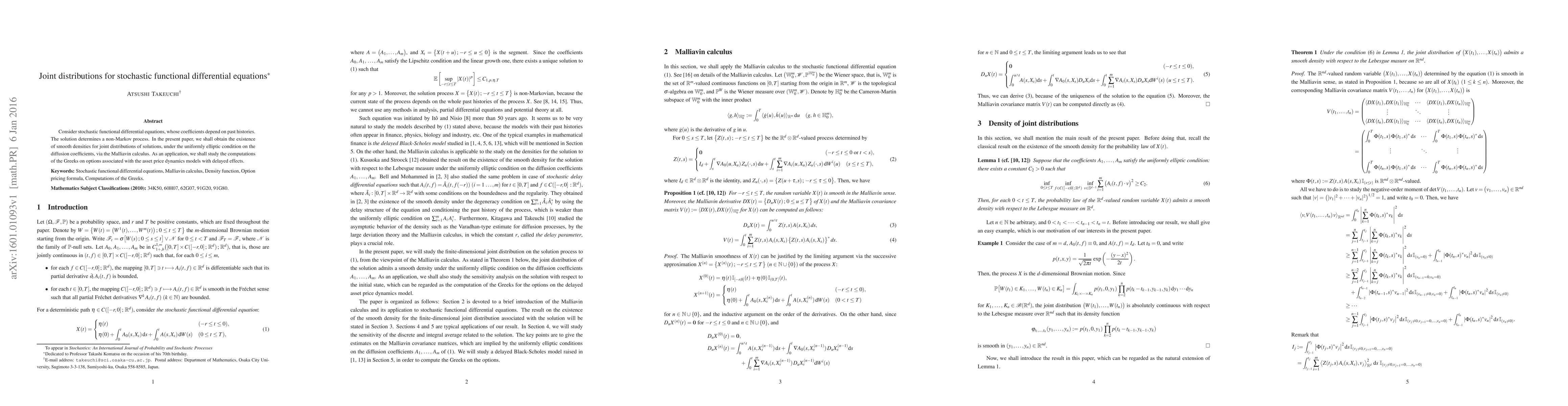 This paper establishes the existence of smooth densities for joint distributions of solutions to stochastic functional differential equations under uniformly elliptic diffusion conditions, using the Malliavin calculus. It also applies the findings to compute the Greeks in options models with delayed asset price dynamics.
