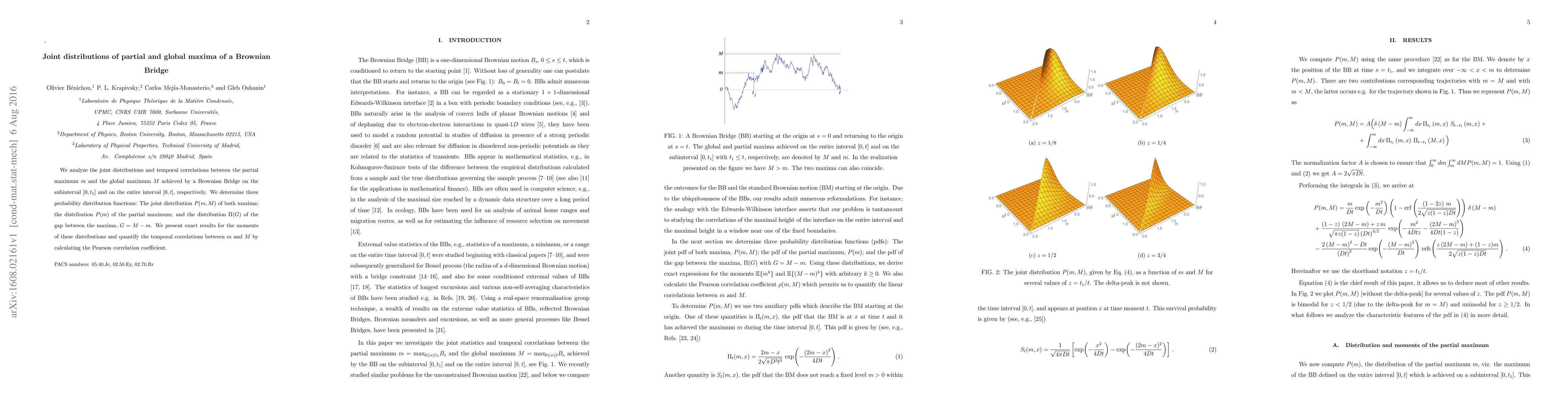 This paper investigates the joint distributions and temporal correlations of partial and global maxima of a Brownian Bridge, determining the joint distribution $P(m,M)$, the partial maximum distribution $P(m)$, and the gap distribution $\Pi(G)$. It also calculates the Pearson correlation coefficient to quantify these correlations.