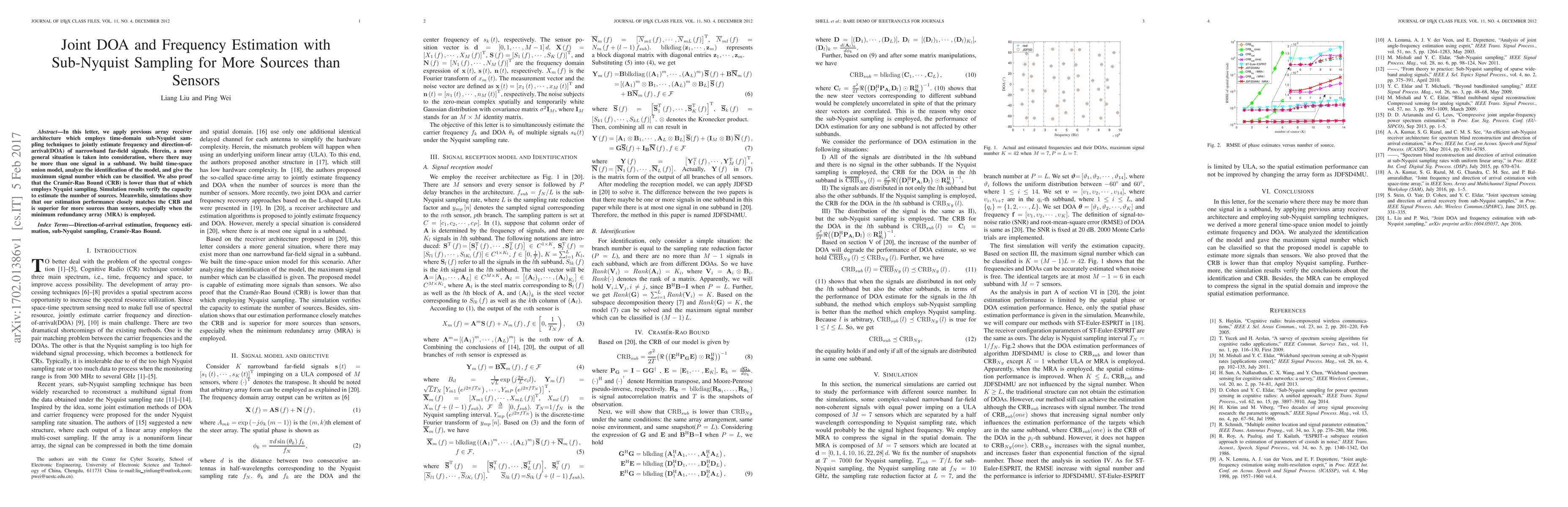 In this letter, we apply previous array receiver architecture which employs time-domain sub-Nyquist sampling techniques to jointly estimate frequency and direction-of-arrival(DOA) of narrowband far-field signals. Herein, a more general situation is taken into consideration, where there may be more than one signal in a subband. We build time-space union model, analyze the identification of the model, and give the maximum signal number which can be classified. We also proof that the Cramer-Rao Bound (CRB) is lower than that of which employs Nyquist sampling. Simulation results verify the capacity to estimate the number of sources. Meanwhile, simulations show that our estimation performance closely matches the CRB and is superior for more sources than sensors, especially when the minimum redundancy array (MRA) is employed.