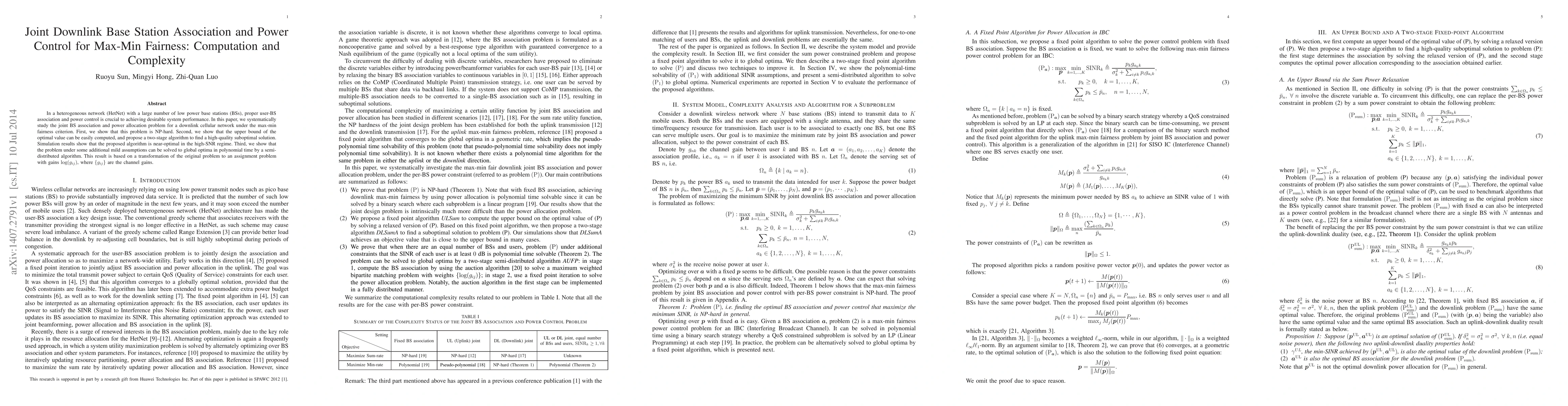 This paper explores the joint base station association and power control problem in heterogeneous networks to maximize min-fairness. It demonstrates the NP-hardness of the problem and proposes a two-stage algorithm for near-optimal solutions, while also presenting a semi-distributed algorithm for polynomial-time global optima under certain conditions.