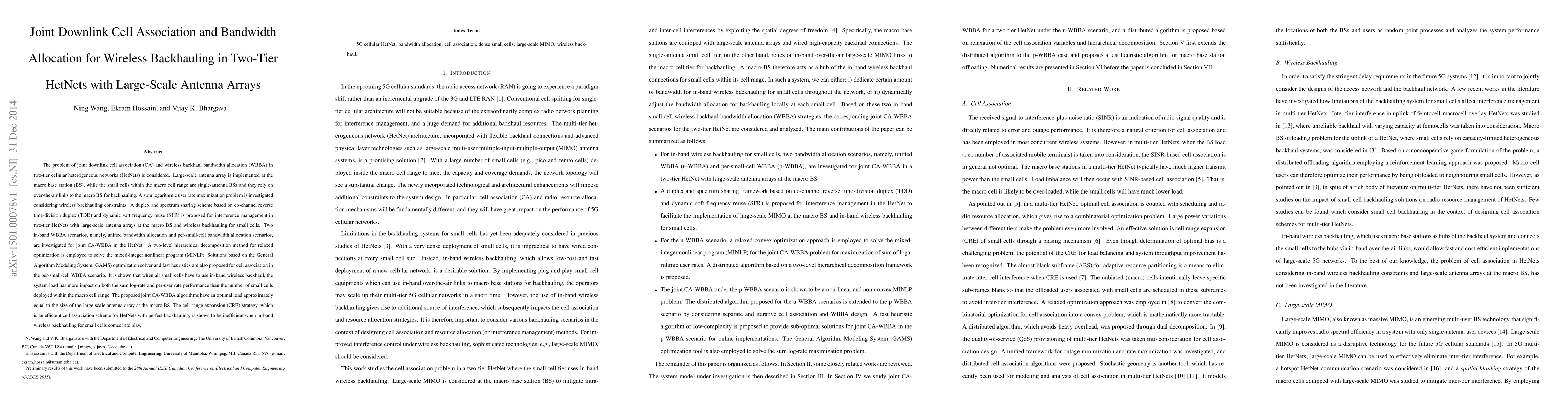 This paper addresses joint downlink cell association and wireless backhaul bandwidth allocation in two-tier HetNets, employing large-scale antenna arrays at macro BSs and single-antenna small cells relying on wireless backhaul. It proposes optimization algorithms for maximizing user rates under wireless backhaul constraints, and demonstrates that system load significantly impacts performance more than the number of small cells.