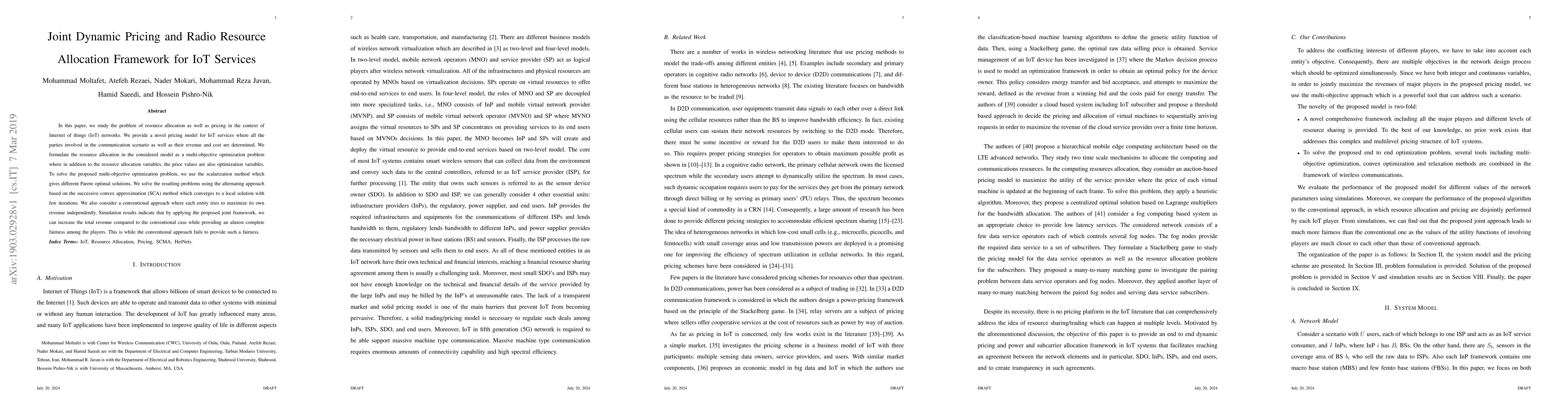 This paper proposes a joint dynamic pricing and radio resource allocation framework for IoT services, optimizing both resource allocation and pricing to maximize total revenue and achieve fairness among parties. The framework employs a multi-objective optimization approach and the SCA method to converge to Pareto optimal solutions, outperforming conventional independent revenue maximization strategies.