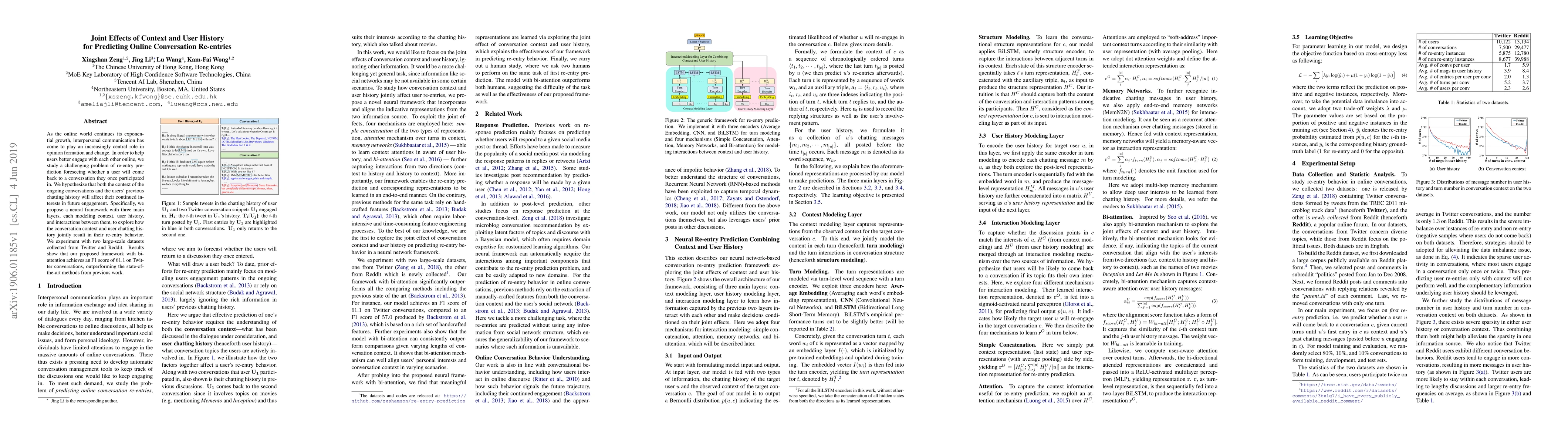 As the online world continues its exponential growth, interpersonal communication has come to play an increasingly central role in opinion formation and change. In order to help users better engage with each other online, we study a challenging problem of re-entry prediction foreseeing whether a user will come back to a conversation they once participated in. We hypothesize that both the context of the ongoing conversations and the users' previous chatting history will affect their continued interests in future engagement. Specifically, we propose a neural framework with three main layers, each modeling context, user history, and interactions between them, to explore how the conversation context and user chatting history jointly result in their re-entry behavior. We experiment with two large-scale datasets collected from Twitter and Reddit. Results show that our proposed framework with bi-attention achieves an F1 score of 61.1 on Twitter conversations, outperforming the state-of-the-art methods from previous work.