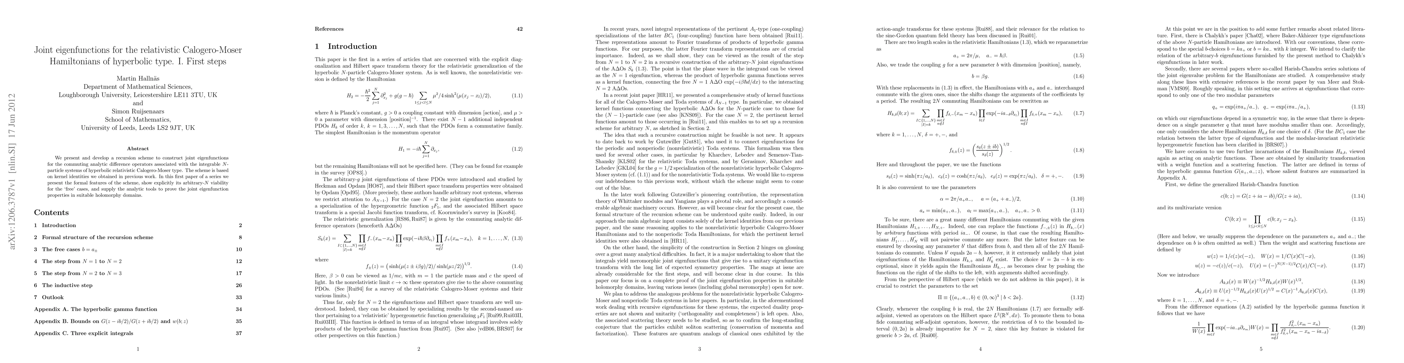 We present and develop a recursion scheme to construct joint eigenfunctions for the commuting analytic difference operators associated with the integrable N-particle systems of hyperbolic relativistic Calogero-Moser type. The scheme is based on kernel identities we obtained in previous work. In this first paper of a series we present the formal features of the scheme, show explicitly its arbitrary-N viability for the `free' cases, and supply the analytic tools to prove the joint eigenfunction properties in suitable holomorphy domains.