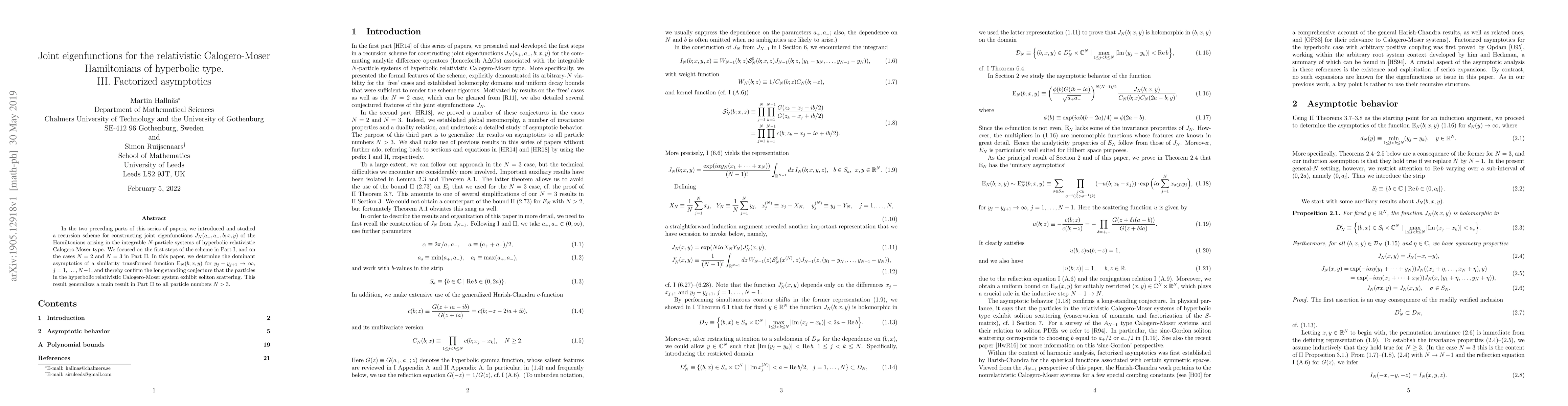 In the two preceding parts of this series of papers, we introduced and studied a recursion scheme for constructing joint eigenfunctions $J_N(a_+, a_-,b;x,y)$ of the Hamiltonians arising in the integrable $N$-particle systems of hyperbolic relativistic Calogero-Moser type. We focused on the first steps of the scheme in Part I, and on the cases $N=2$ and $N=3$ in Part II. In this paper, we determine the dominant asymptotics of a similarity transformed function $\rE_N(b;x,y)$ for $y_j-y_{j+1}\to\infty$, $j=1,\ldots, N-1$, and thereby confirm the long standing conjecture that the particles in the hyperbolic relativistic Calogero-Moser system exhibit soliton scattering. This result generalizes a main result in Part II to all particle numbers $N>3$.