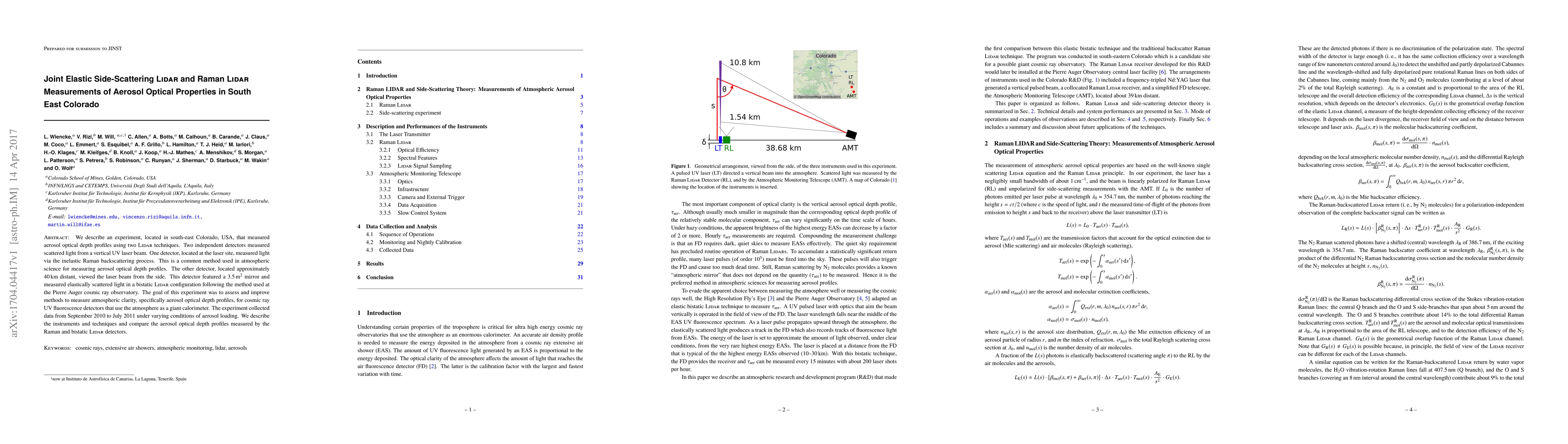 This study combines Raman and bistatic Lidar techniques to measure aerosol optical depth profiles in south-east Colorado, aiming to improve atmospheric clarity measurements for cosmic ray detectors. The experiment compared data from two independent detectors, one using Raman backscattering and the other measuring side-scattered light, over a year under varying aerosol conditions.