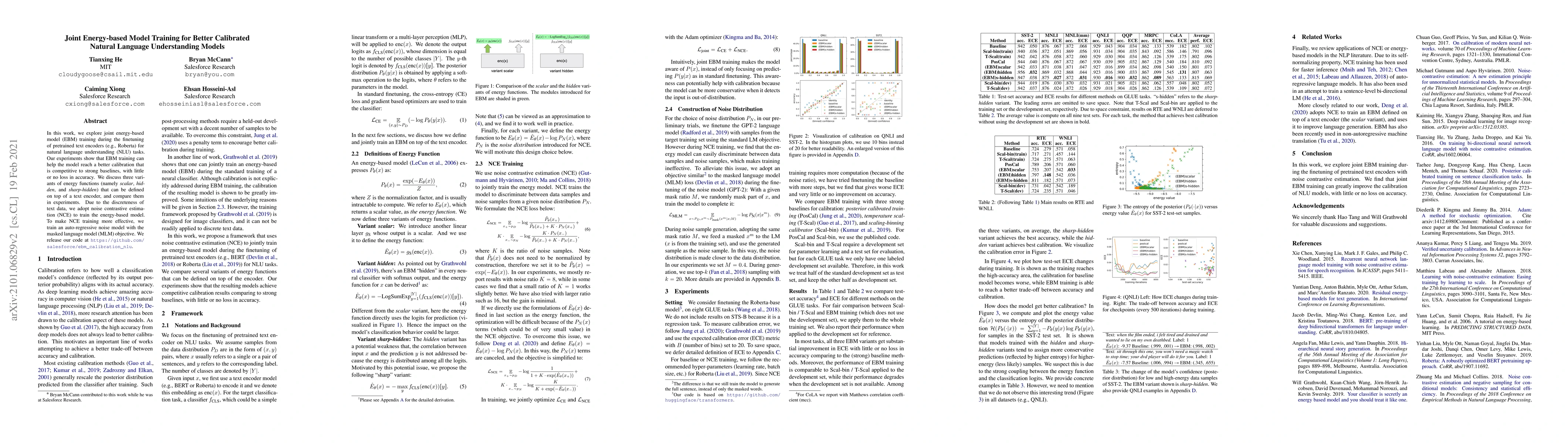This paper investigates joint energy-based model training for finetuning pretrained text encoders to improve calibration in natural language understanding tasks, achieving competitive calibration without accuracy loss. It compares three energy function variants and employs noise contrastive estimation with an auto-regressive noise model for effective training.