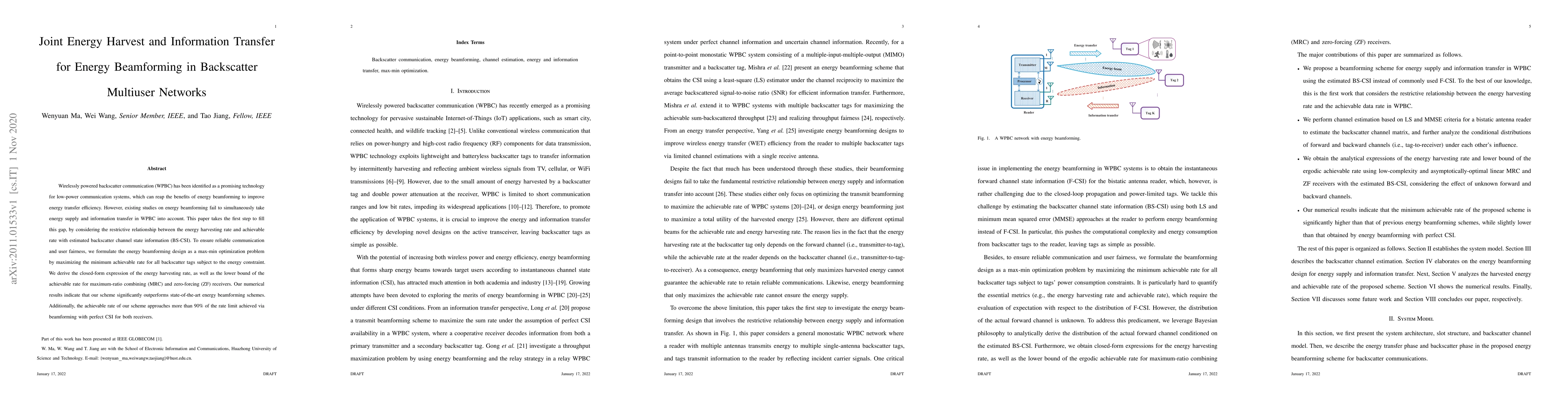 This paper proposes a joint energy beamforming scheme for wirelessly powered backscatter communication networks, addressing the gap between energy supply and information transfer. It formulates an optimization problem to maximize minimum achievable rates while ensuring user fairness, achieving significant performance improvements over existing methods.