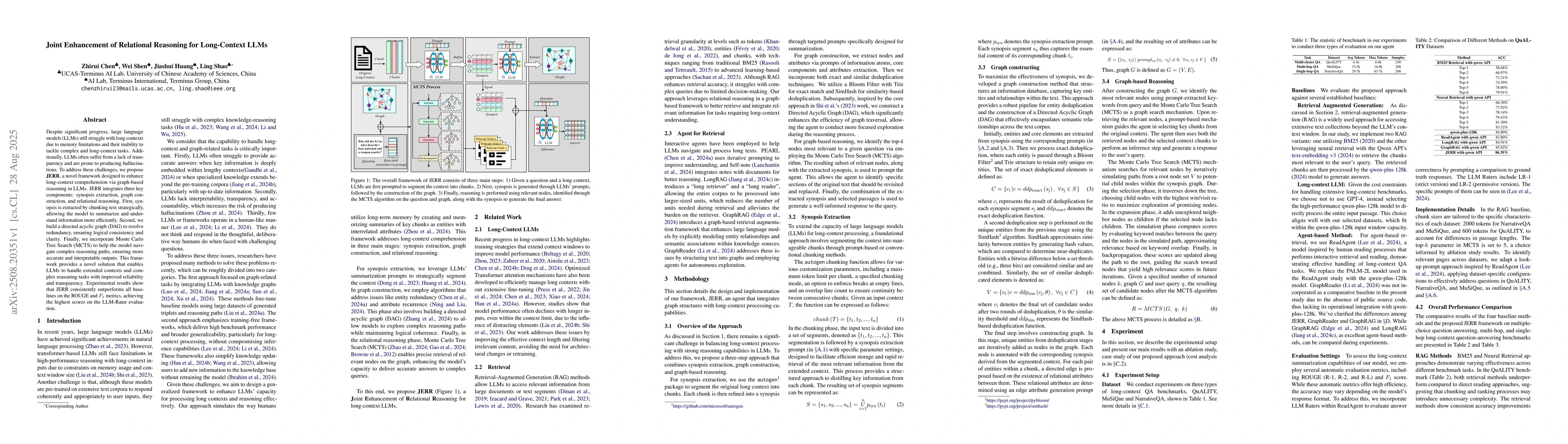 Despite significant progress, large language models (LLMs) still struggle with long contexts due to memory limitations and their inability to tackle complex and long-context tasks. Additionally, LLMs often suffer from a lack of transparency and are prone to producing hallucinations. To address these challenges, we propose \textbf{JERR}, a novel framework designed to enhance long-context comprehension via graph-based reasoning in LLMs. JERR integrates three key components: synopsis extraction, graph construction, and relational reasoning. First, synopsis is extracted by chunking text strategically, allowing the model to summarize and understand information more efficiently. Second, we build a directed acyclic graph (DAG) to resolve redundancy, ensuring logical consistency and clarity. Finally, we incorporate Monte Carlo Tree Search (MCTS) to help the model navigate complex reasoning paths, ensuring more accurate and interpretable outputs. This framework provides a novel solution that enables LLMs to handle extended contexts and complex reasoning tasks with improved reliability and transparency. Experimental results show that JERR consistently outperforms all baselines on the ROUGE and F1 metrics, achieving the highest scores on the LLM-Rater evaluation.