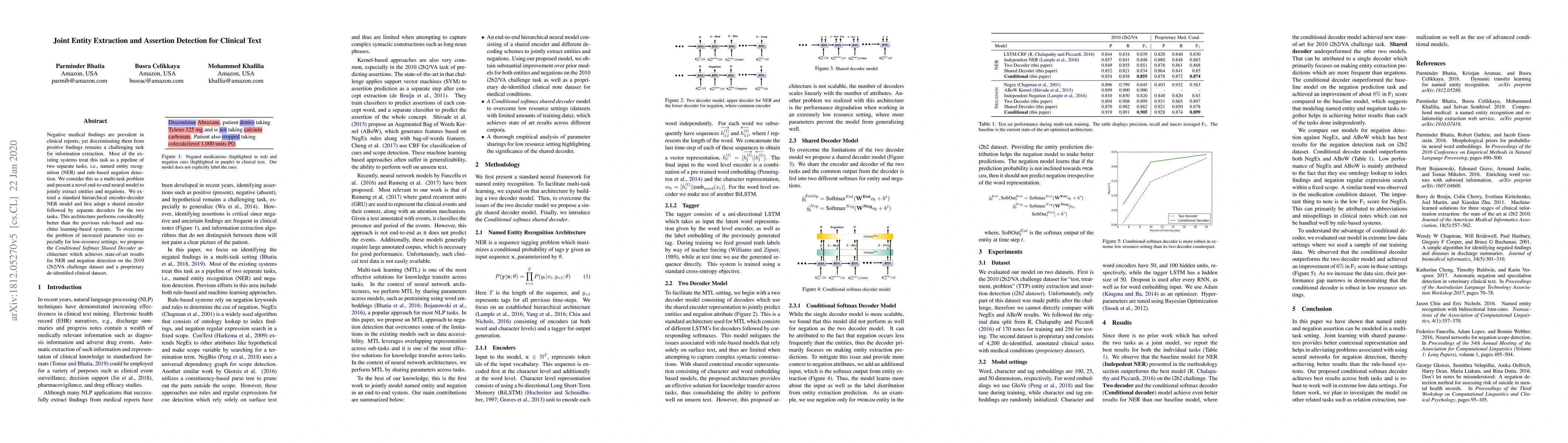 This paper proposes a joint neural model for extracting entities and detecting negations in clinical text, addressing the challenge of distinguishing negative from positive findings. The model outperforms previous rule-based and machine learning systems, achieving state-of-the-art results on clinical datasets.