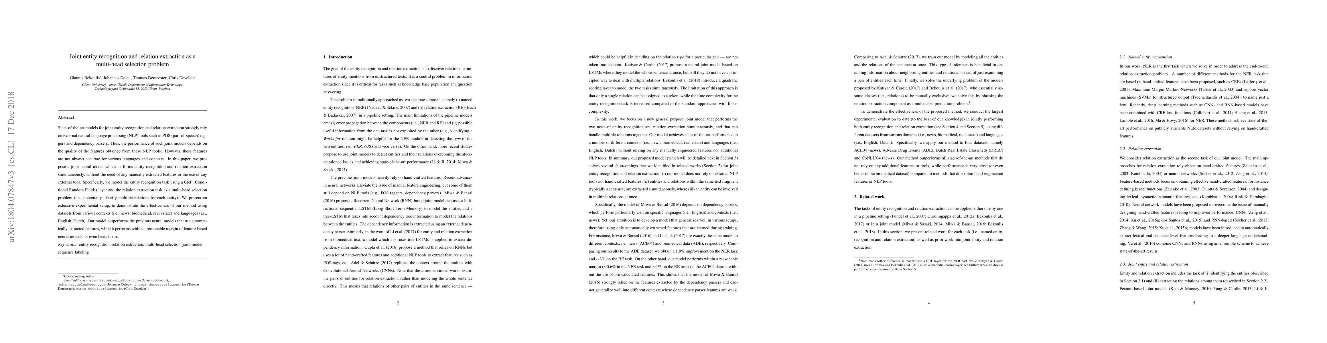 This paper proposes a joint neural model for entity recognition and relation extraction that eliminates reliance on external NLP tools, using a CRF layer for entity recognition and a multi-head selection approach for relation extraction. Experimental results show the model outperforms previous neural models using automatic features and performs competitively against feature-based models.
