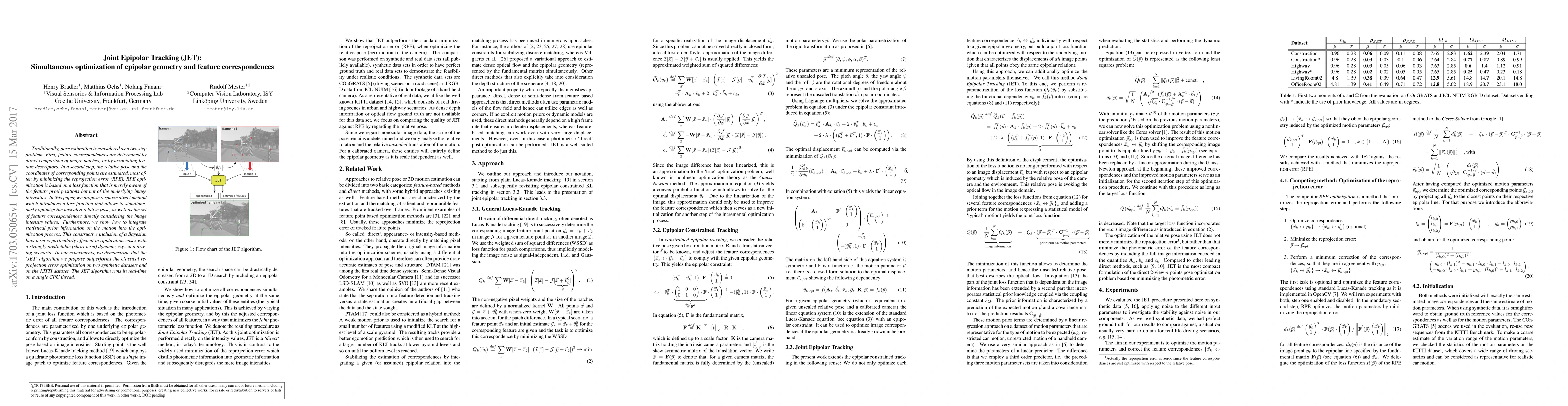 Traditionally, pose estimation is considered as a two step problem. First, feature correspondences are determined by direct comparison of image patches, or by associating feature descriptors. In a second step, the relative pose and the coordinates of corresponding points are estimated, most often by minimizing the reprojection error (RPE). RPE optimization is based on a loss function that is merely aware of the feature pixel positions but not of the underlying image intensities. In this paper, we propose a sparse direct method which introduces a loss function that allows to simultaneously optimize the unscaled relative pose, as well as the set of feature correspondences directly considering the image intensity values. Furthermore, we show how to integrate statistical prior information on the motion into the optimization process. This constructive inclusion of a Bayesian bias term is particularly efficient in application cases with a strongly predictable (short term) dynamic, e.g. in a driving scenario. In our experiments, we demonstrate that the JET algorithm we propose outperforms the classical reprojection error optimization on two synthetic datasets and on the KITTI dataset. The JET algorithm runs in real-time on a single CPU thread.