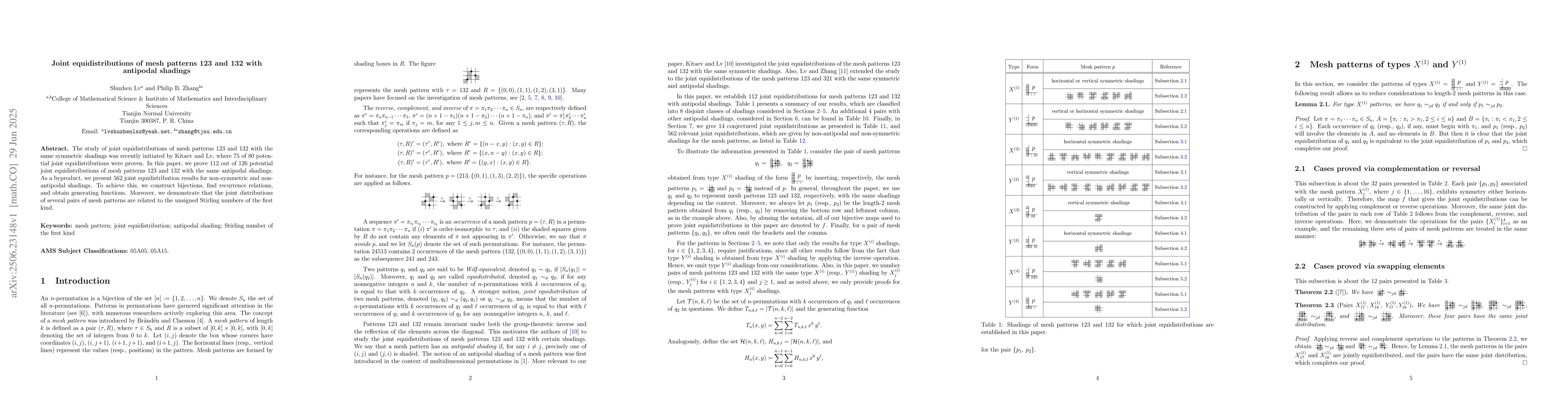 The study of joint equidistributions of mesh patterns 123 and 132 with the same symmetric shadings was recently initiated by Kitaev and Lv, where 75 of 80 potential joint equidistributions were proven. In this paper, we prove 112 out of 126 potential joint equidistributions of mesh patterns 123 and 132 with the same antipodal shadings. As a byproduct, we present 562 joint equidistribution results for non-symmetric and non-antipodal shadings. To achieve this, we construct bijections, find recurrence relations, and obtain generating functions. Moreover, we demonstrate that the joint distributions of several pairs of mesh patterns are related to the unsigned Stirling numbers of the first kind.