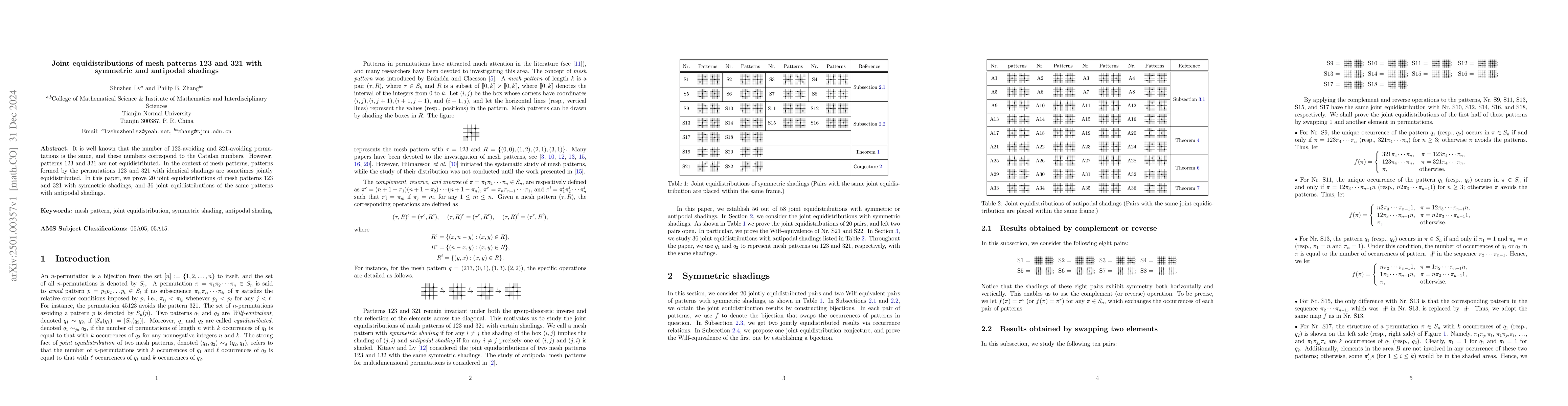 This paper demonstrates that mesh patterns formed by permutations 123 and 321 exhibit joint equidistribution under symmetric and antipodal shadings, proving 20 and 36 instances respectively, despite the individual patterns not being equidistributed.