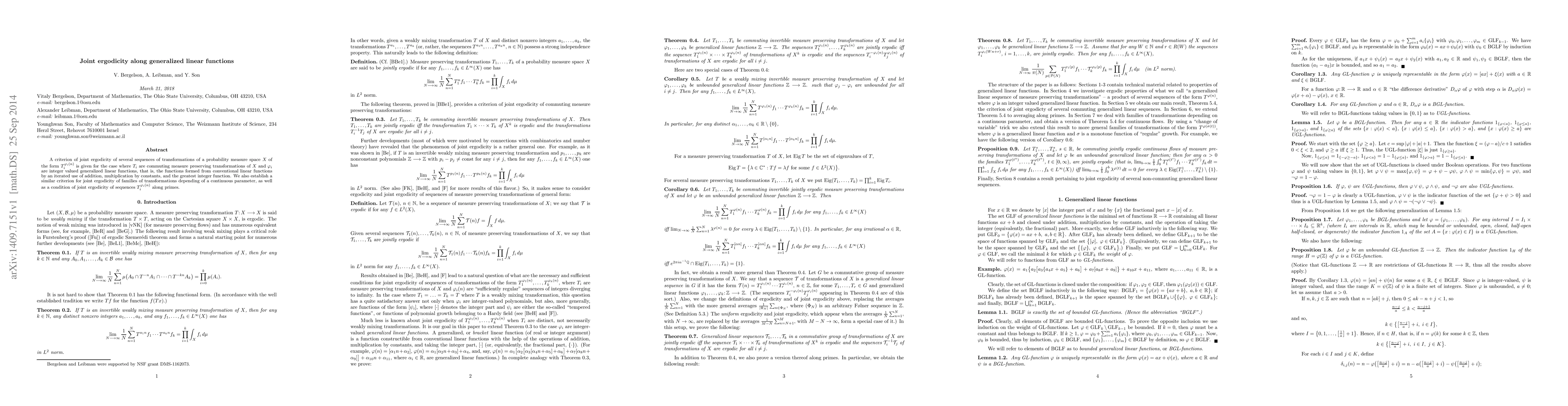 This paper presents a criterion for joint ergodicity of sequences of transformations $T_{i}^{\phi_{i}(n)}$ in a probability measure space, where $T_{i}$ are commuting measure-preserving transformations and $\phi_{i}$ are generalized linear functions. It also establishes criteria for families of transformations depending on a continuous parameter and for sequences along primes.