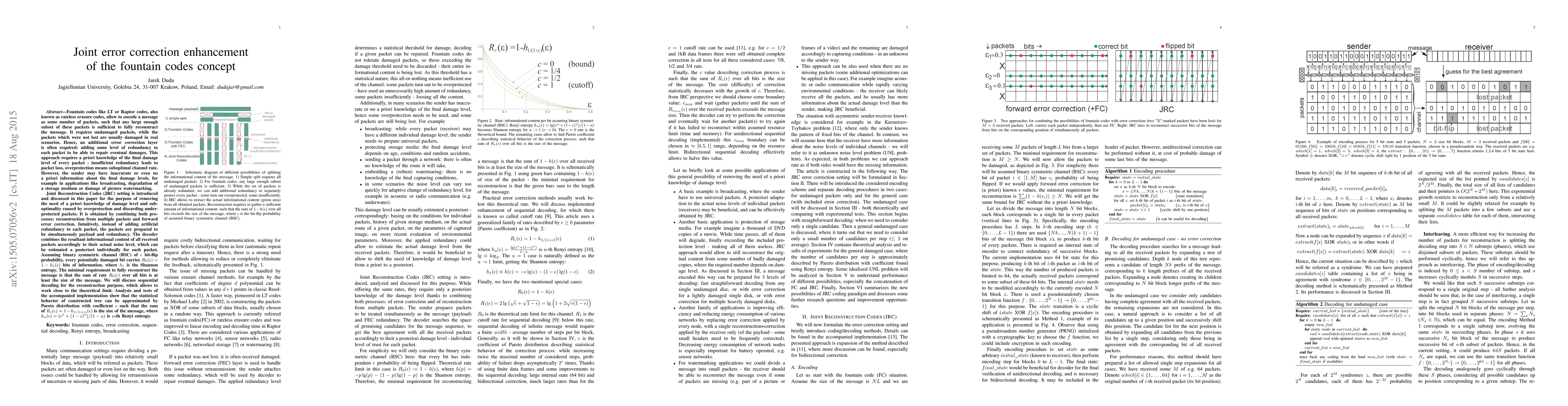 Fountain codes like LT or Raptor codes, also known as rateless erasure codes, allow to encode a message as some number of packets, such that any large enough subset of these packets is sufficient to fully reconstruct the message. It requires undamaged packets, while the packets which were not lost are usually damaged in real scenarios. Hence, an additional error correction layer is often required: adding some level of redundancy to each packet to be able to repair eventual damages. This approach requires a priori knowledge of the final damage level of every packet - insufficient redundancy leads to packet loss, overprotection means suboptimal channel rate. However, the sender may have inaccurate or even no a priori information about the final damage levels, for example in applications like broadcasting, degradation of a storage medium or damage of picture watermarking. Joint Reconstruction Codes (JRC) setting is introduced and discussed in this paper for the purpose of removing the need of a priori knowledge of damage level and sub-optimality caused by overprotection and discarding underprotected packets. It is obtained by combining both processes: reconstruction from multiple packets and forward error correction. The decoder combines the resultant informational content of all received packets accordingly to their actual noise level, which can be estimated a posteriori individually for each packet. Assuming binary symmetric channel (BSC) of $\epsilon$ bit-flip probability, every potentially damaged bit carries $R_0(\epsilon)=1-h_1(\epsilon)$ bits of information, where $h_1$ is the Shannon entropy. The minimal requirement to fully reconstruct the message is that the sum of rate $R_0(\epsilon)$ over all bits is at least the size of the message. We will discuss sequential decoding for the reconstruction purpose, which statistical behavior can be estimated using Renyi entropy.