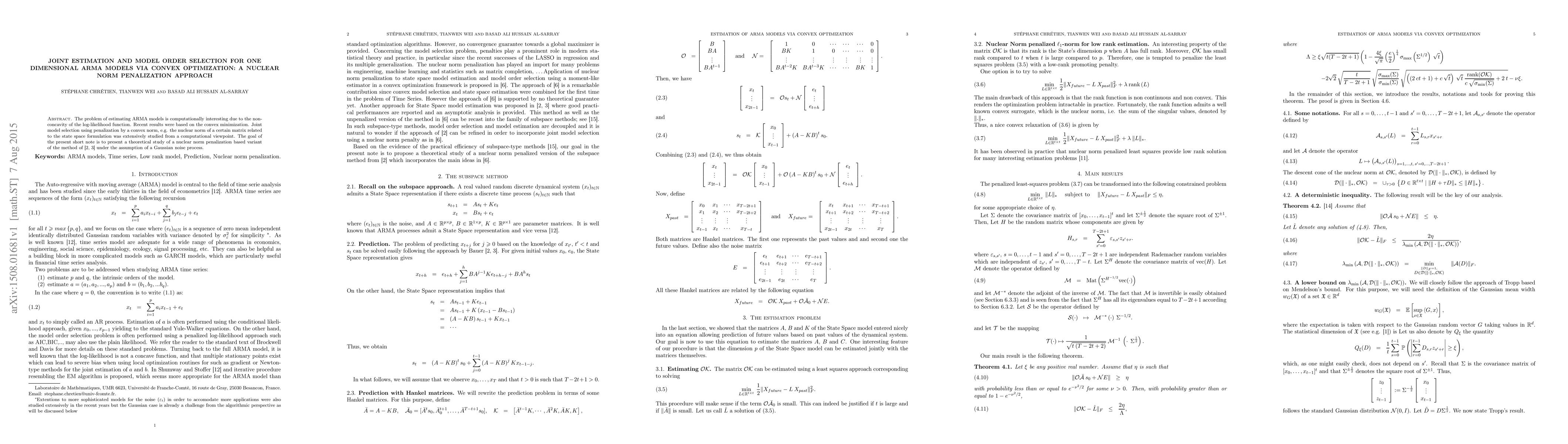 This paper presents a method for estimating ARMA models using convex optimization with nuclear norm penalization, providing a more efficient approach to joint estimation and model order selection.