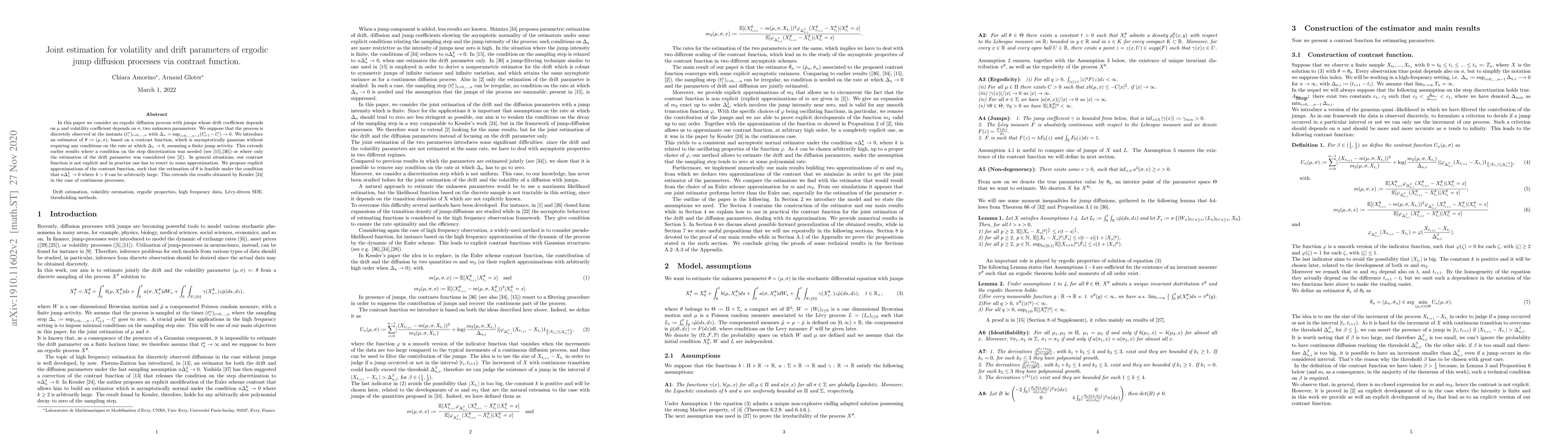 This paper proposes an estimator for the drift and volatility parameters of ergodic jump diffusion processes using a contrast function, which is shown to be asymptotically Gaussian without stringent discretization conditions. The method extends previous results by allowing for higher jump activity and providing feasible approximations for practical implementation.