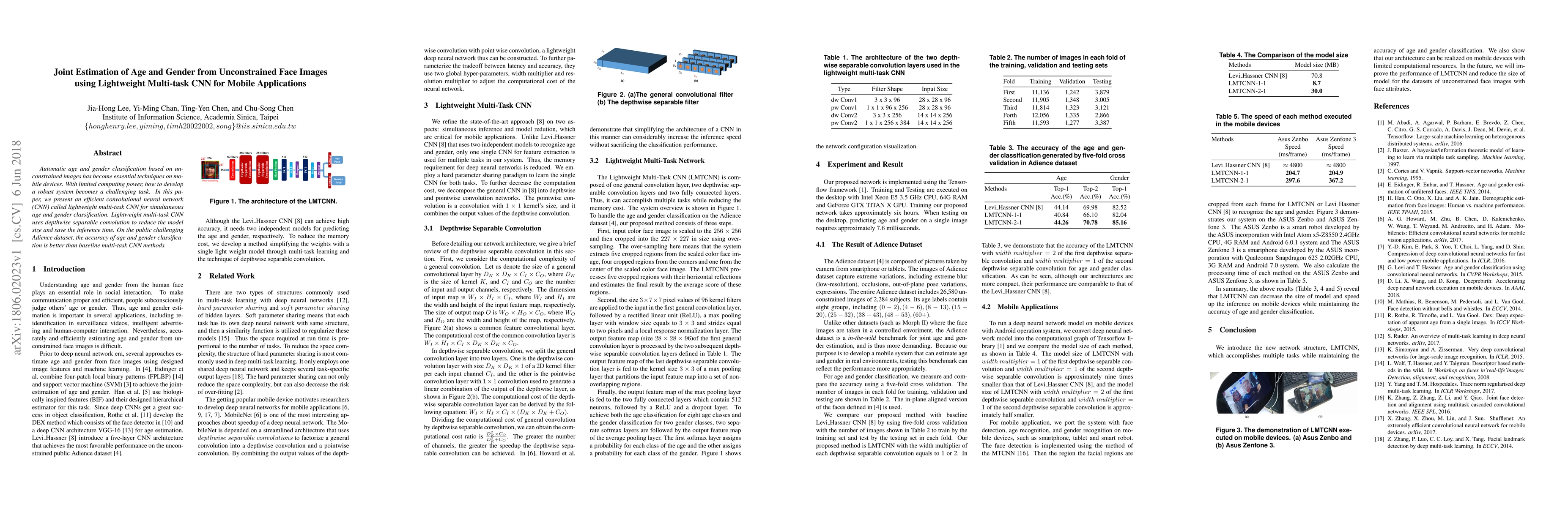 This paper introduces a lightweight multi-task CNN for simultaneous age and gender classification from unconstrained face images, utilizing depthwise separable convolutions to enhance efficiency. The model achieves superior accuracy compared to baseline methods on the Adience dataset, making it suitable for mobile applications with limited computing power.