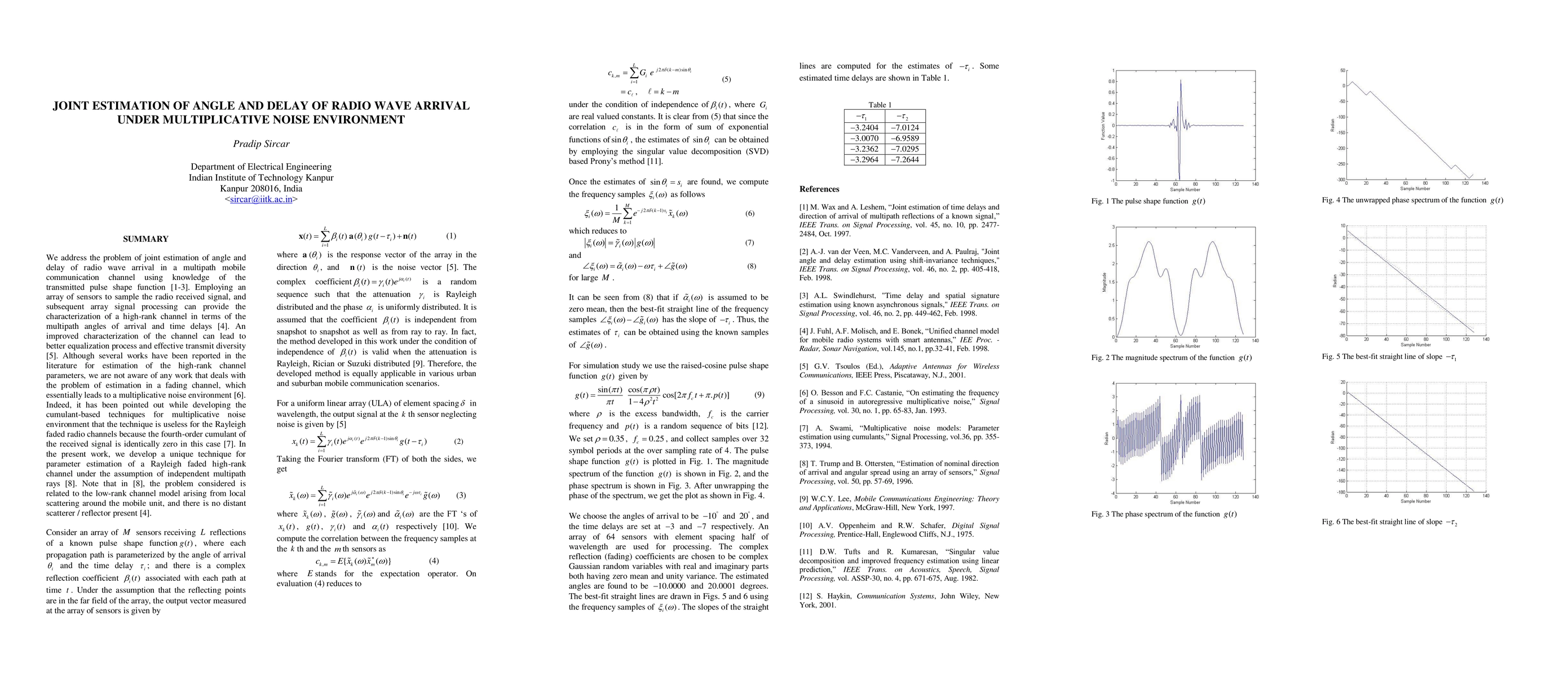 This paper introduces a new method for jointly estimating the angle and delay of radio wave arrival in a multipath mobile communication channel, specifically addressing the challenges posed by a multiplicative noise environment. The technique utilizes an array of sensors to sample the received signal and employs array signal processing to characterize the high-rank channel parameters.