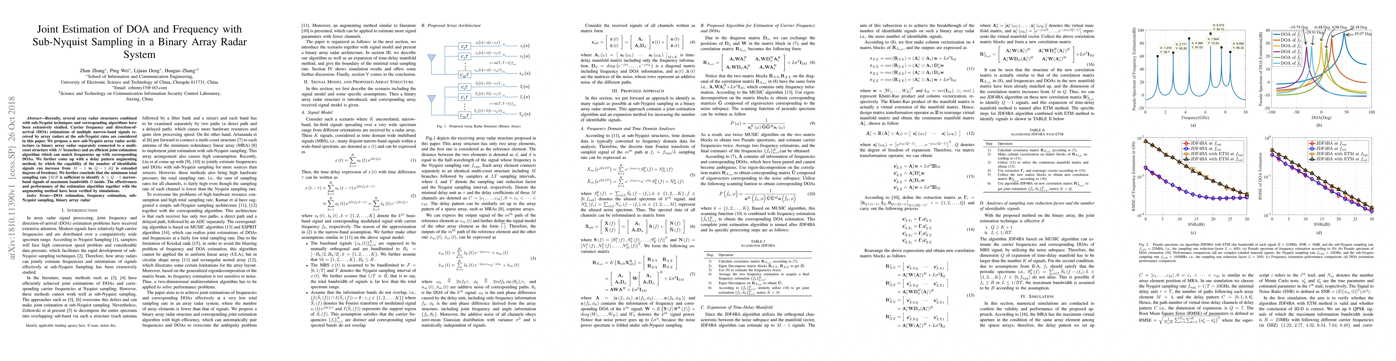 This paper proposes a novel sub-Nyquist array radar architecture and a joint estimation algorithm for identifying frequency and direction-of-arrival (DOA) of multiple narrow-band signals. The method enhances the number of identifiable signals and verifies the effectiveness through simulations.
