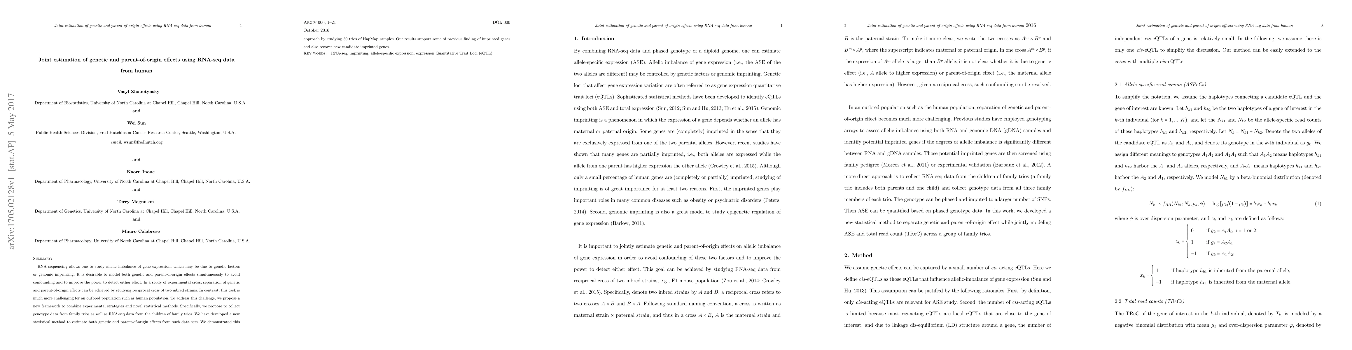 This paper proposes a novel framework combining experimental strategies and statistical methods to jointly estimate genetic and parent-of-origin effects using RNA-seq data from human family trios. The approach successfully identifies both known and new imprinted genes in a study of 30 trios from HapMap samples.
