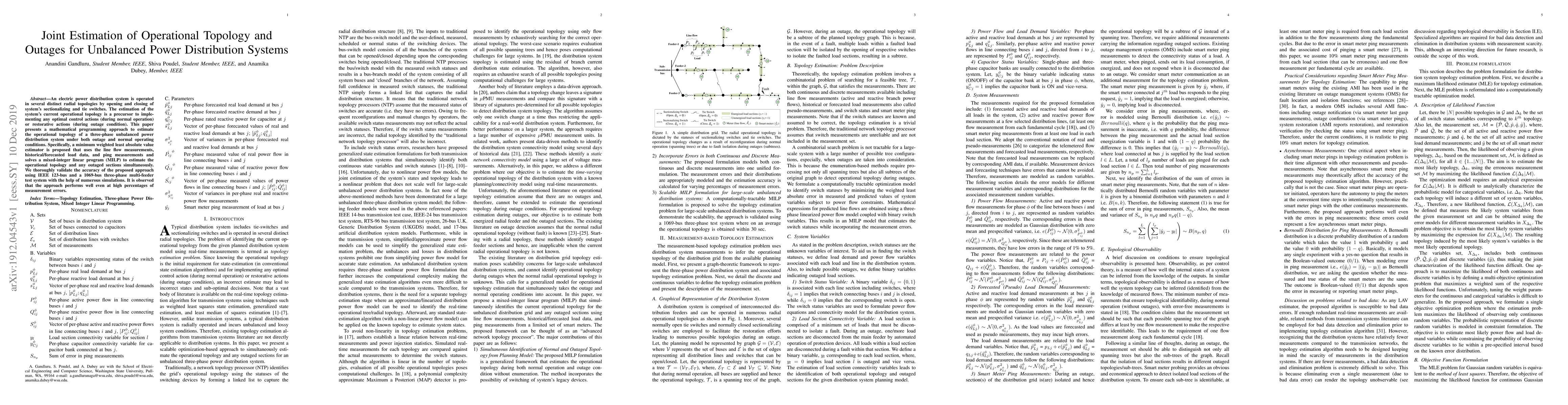 This paper proposes a mathematical programming approach using a minimum weighted least absolute value estimator to estimate the operational topology of unbalanced power distribution systems under both normal and outage conditions. The method integrates line flow measurements, load data, and ping measurements to solve a mixed-integer linear program, demonstrating accuracy even with high measurement errors through simulations on IEEE 123-bus and 1069-bus test systems.