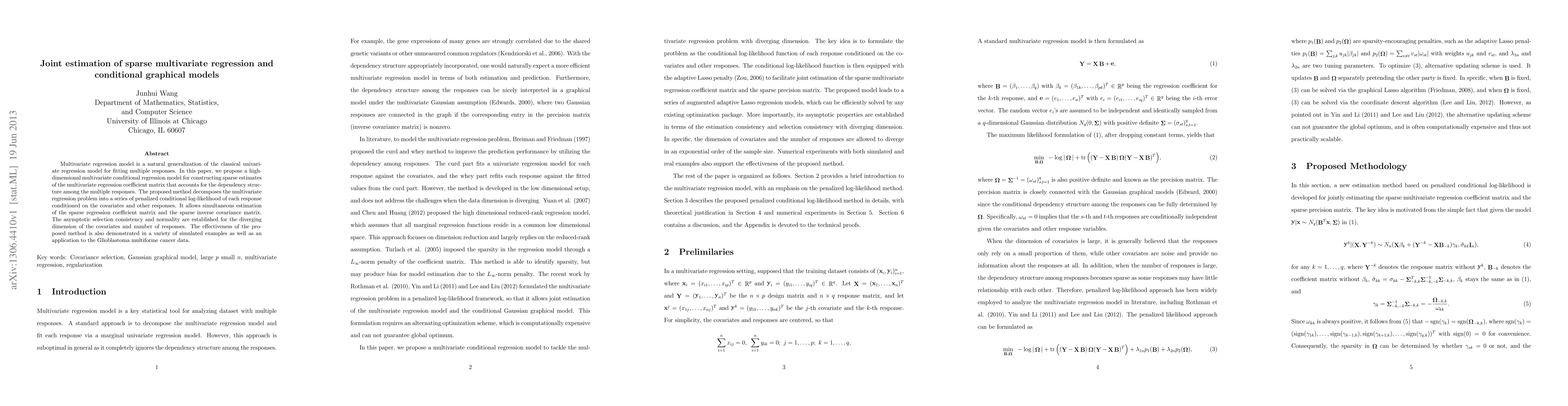 Multivariate regression model is a natural generalization of the classical univari- ate regression model for fitting multiple responses. In this paper, we propose a high- dimensional multivariate conditional regression model for constructing sparse estimates of the multivariate regression coefficient matrix that accounts for the dependency struc- ture among the multiple responses. The proposed method decomposes the multivariate regression problem into a series of penalized conditional log-likelihood of each response conditioned on the covariates and other responses. It allows simultaneous estimation of the sparse regression coefficient matrix and the sparse inverse covariance matrix. The asymptotic selection consistency and normality are established for the diverging dimension of the covariates and number of responses. The effectiveness of the pro- posed method is also demonstrated in a variety of simulated examples as well as an application to the Glioblastoma multiforme cancer data.