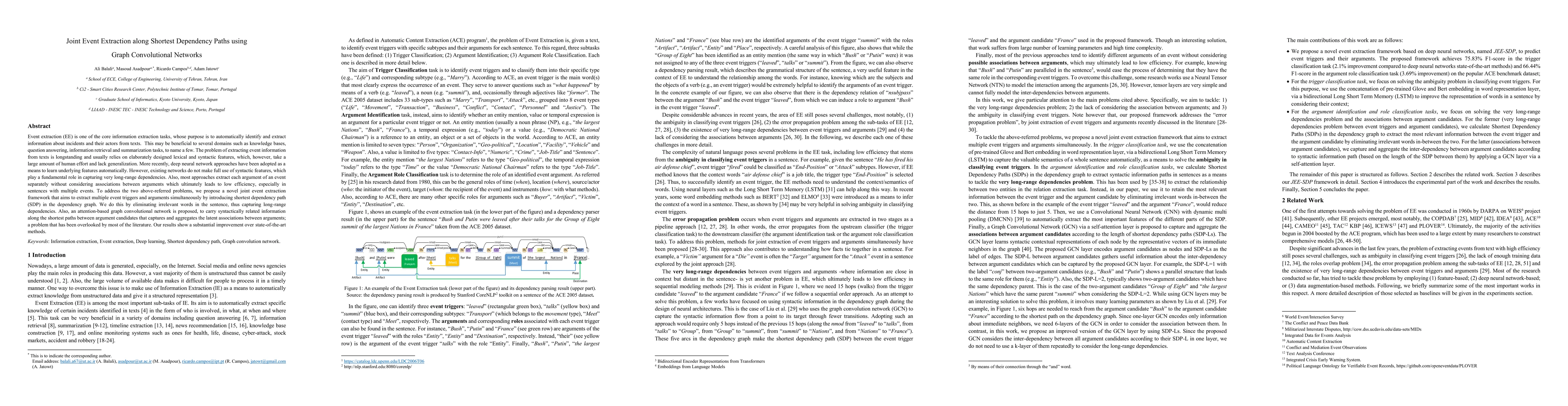 This research introduces a novel event extraction framework utilizing shortest dependency paths in dependency graphs to simultaneously extract multiple event triggers and arguments. By employing an attention-based graph convolutional network, it captures syntactically related information along shortest paths, improving long-range dependency handling and argument associations, leading to significant performance gains over existing methods.