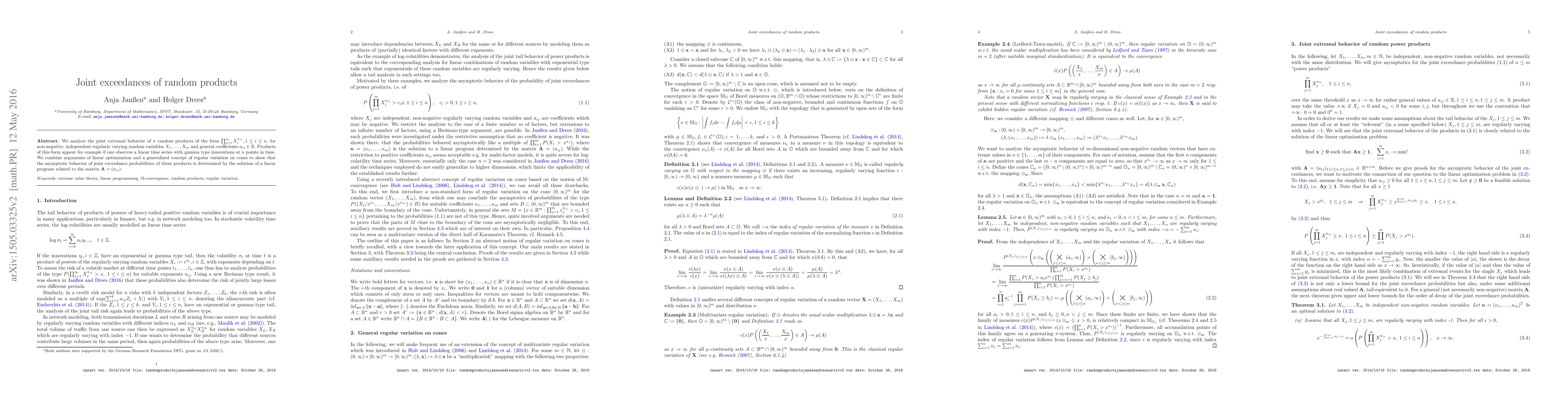 This research investigates the combined extreme behavior of multiple random products formed from independent, regularly varying random variables. By merging linear optimization and a broadened regular variation concept on cones, the study reveals that the asymptotic joint exceedance probabilities of these products are governed by a linear program linked to the coefficient matrix. This has implications in modeling scenarios like linear time series with gamma-type innovation shocks observed at multiple time points.