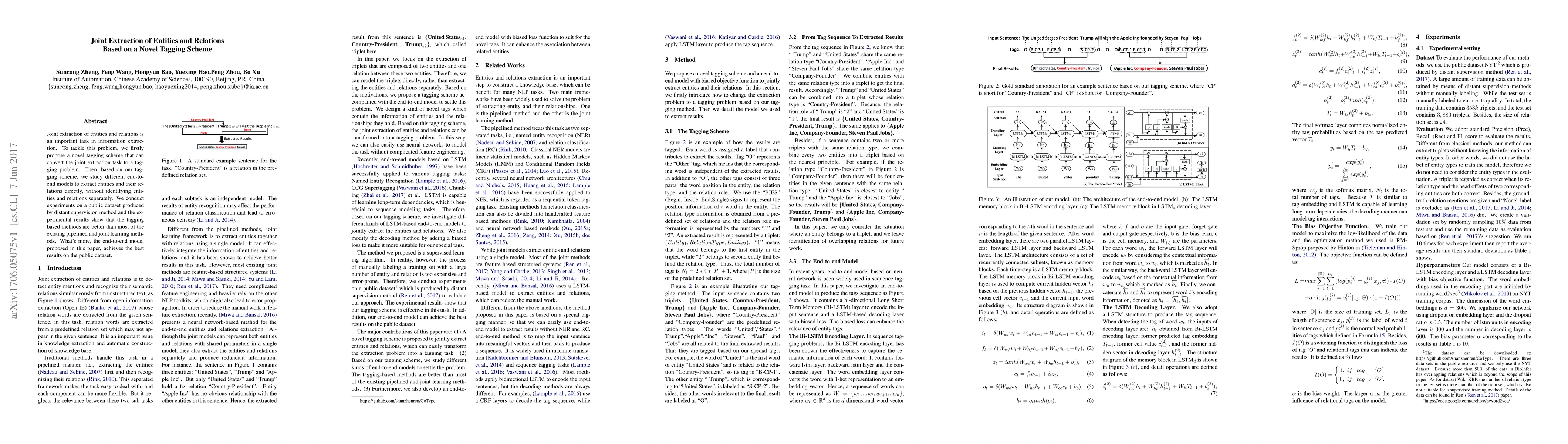 This paper proposes a novel tagging scheme to convert joint entity and relation extraction into a tagging problem, and develops end-to-end models using this scheme. Experimental results show that the tagging-based methods outperform existing pipelined and joint learning approaches, with the proposed end-to-end model achieving the best performance on a public dataset.