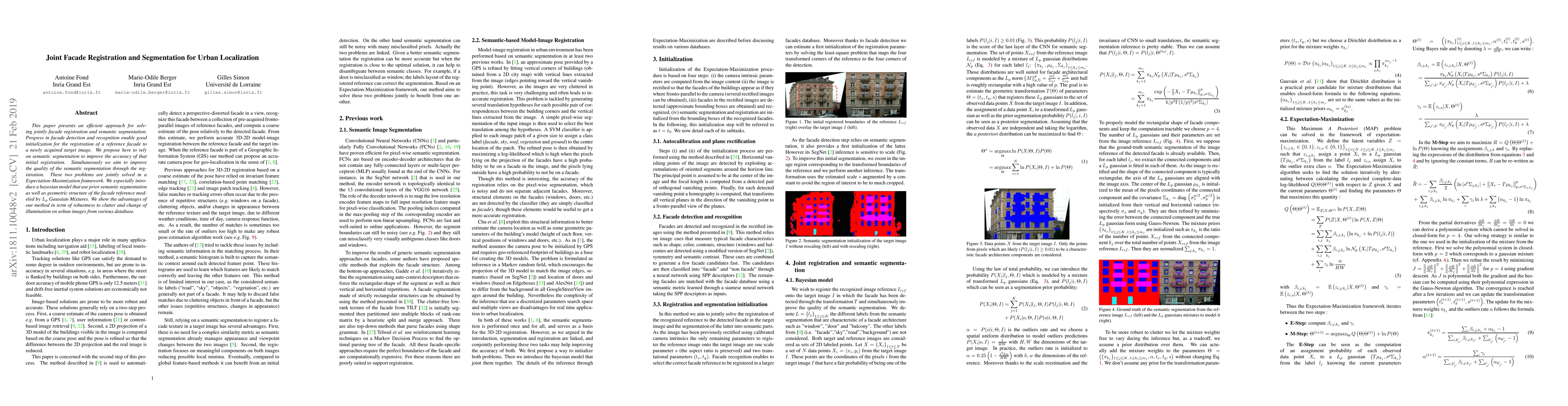 This paper proposes a method to jointly register and segment facades in urban images using Expectation-Maximization framework and Bayesian model, improving accuracy and robustness to clutter and illumination changes.