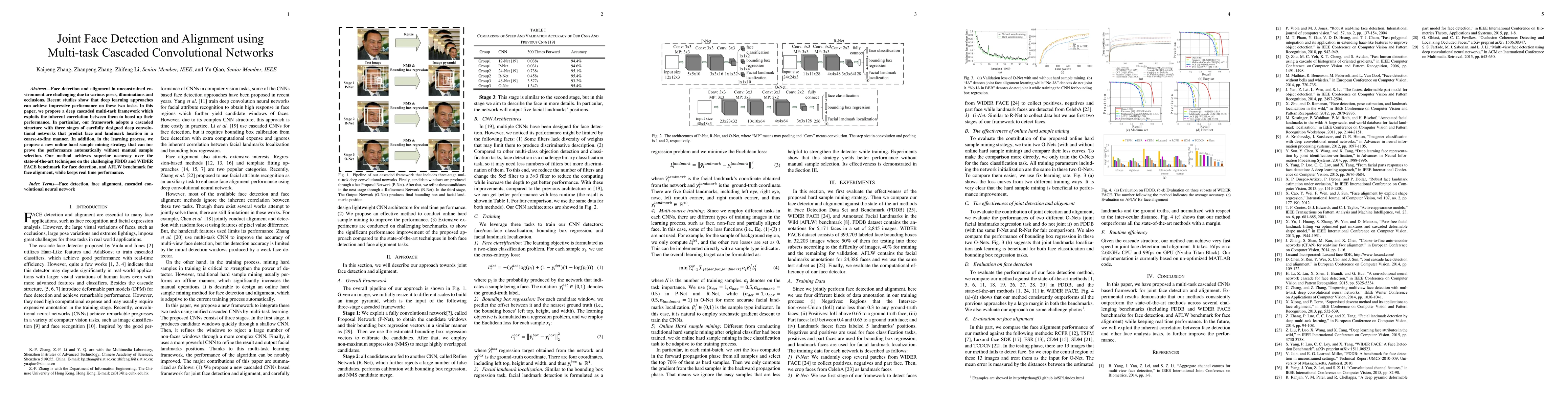 Face detection and alignment in unconstrained environment are challenging due to various poses, illuminations and occlusions. Recent studies show that deep learning approaches can achieve impressive performance on these two tasks. In this paper, we propose a deep cascaded multi-task framework which exploits the inherent correlation between them to boost up their performance. In particular, our framework adopts a cascaded structure with three stages of carefully designed deep convolutional networks that predict face and landmark location in a coarse-to-fine manner. In addition, in the learning process, we propose a new online hard sample mining strategy that can improve the performance automatically without manual sample selection. Our method achieves superior accuracy over the state-of-the-art techniques on the challenging FDDB and WIDER FACE benchmark for face detection, and AFLW benchmark for face alignment, while keeps real time performance.