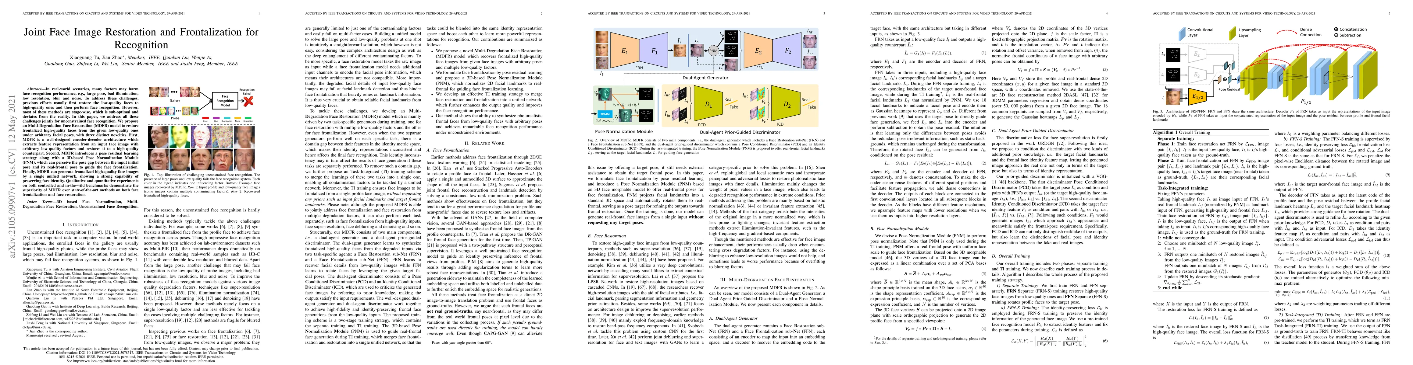 This paper proposes a Multi-Degradation Face Restoration (MDFR) model to jointly restore and frontalize low-quality faces for improved recognition, featuring an encoder-decoder architecture, pose residual learning, and a 3D-based Pose Normalization Module. The model demonstrates superior performance in both face frontalization and restoration compared to state-of-the-art methods.
