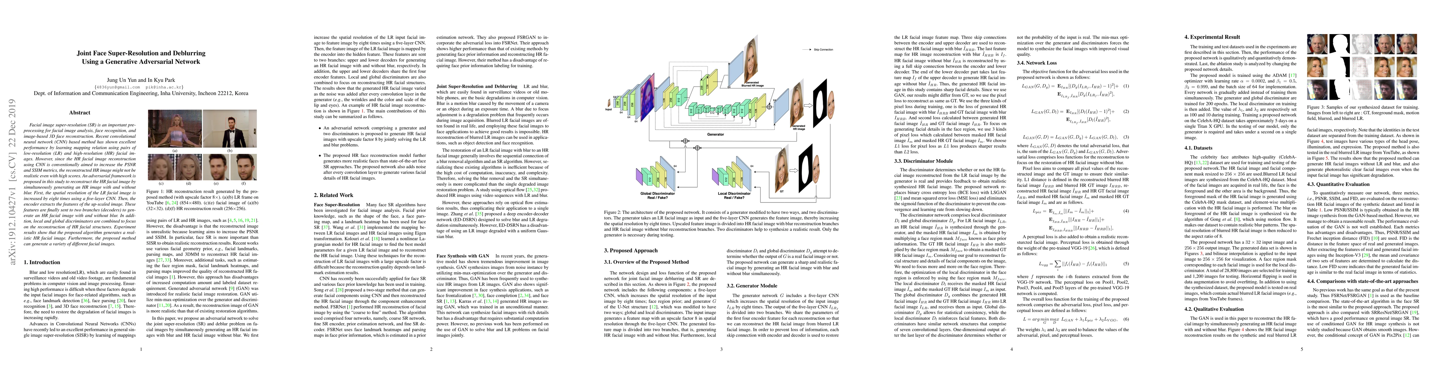 Facial image super-resolution (SR) is an important preprocessing for facial image analysis, face recognition, and image-based 3D face reconstruction. Recent convolutional neural network (CNN) based method has shown excellent performance by learning mapping relation using pairs of low-resolution (LR) and high-resolution (HR) facial images. However, since the HR facial image reconstruction using CNN is conventionally aimed to increase the PSNR and SSIM metrics, the reconstructed HR image might not be realistic even with high scores. An adversarial framework is proposed in this study to reconstruct the HR facial image by simultaneously generating an HR image with and without blur. First, the spatial resolution of the LR facial image is increased by eight times using a five-layer CNN. Then, the encoder extracts the features of the up-scaled image. These features are finally sent to two branches (decoders) to generate an HR facial image with and without blur. In addition, local and global discriminators are combined to focus on the reconstruction of HR facial structures. Experiment results show that the proposed algorithm generates a realistic HR facial image. Furthermore, the proposed method can generate a variety of different facial images.