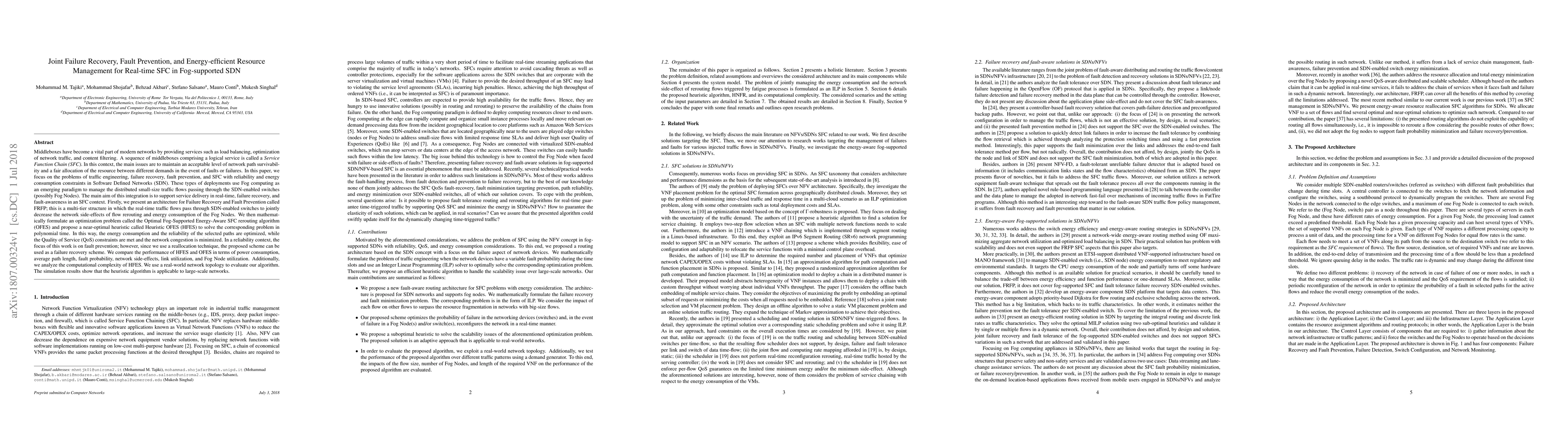This paper proposes an architecture for failure recovery and fault prevention in Fog-supported Software Defined Networks (SDN) to manage real-time Service Function Chains (SFC) while optimizing energy consumption and reliability. It introduces an optimization algorithm and a near-optimal heuristic to minimize power usage and network congestion, demonstrating their effectiveness through simulations on a real-world network topology.