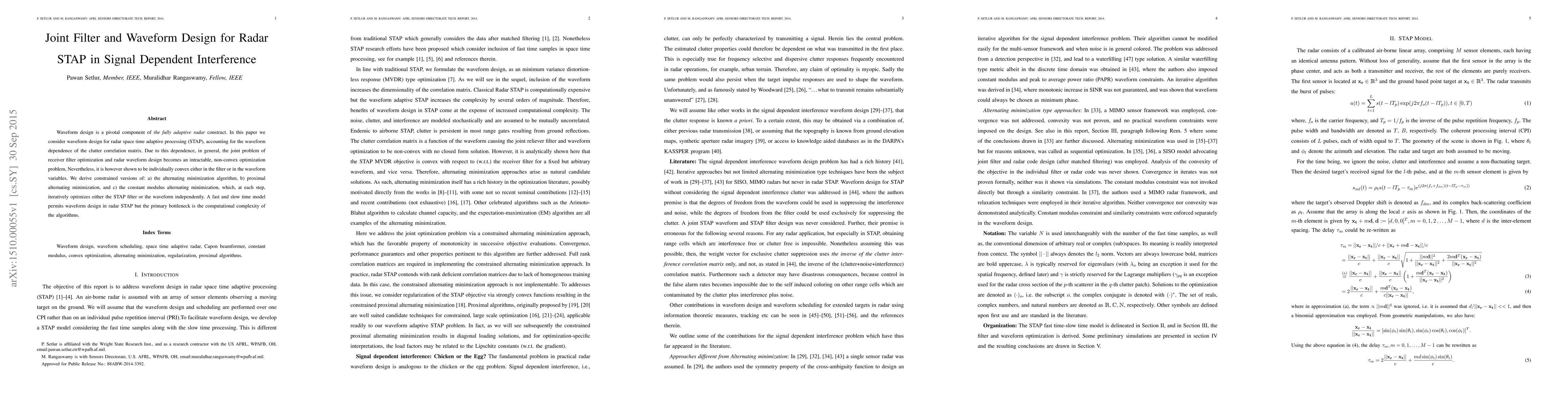 Waveform design is a pivotal component of the fully adaptive radar construct. In this paper we consider waveform design for radar space time adaptive processing (STAP), accounting for the waveform dependence of the clutter correlation matrix. Due to this dependence, in general, the joint problem of receiver filter optimization and radar waveform design becomes an intractable, non-convex optimization problem, Nevertheless, it is however shown to be individually convex either in the filter or in the waveform variables. We derive constrained versions of: a) the alternating minimization algorithm, b) proximal alternating minimization, and c) the constant modulus alternating minimization, which, at each step, iteratively optimizes either the STAP filter or the waveform independently. A fast and slow time model permits waveform design in radar STAP but the primary bottleneck is the computational complexity of the algorithms.