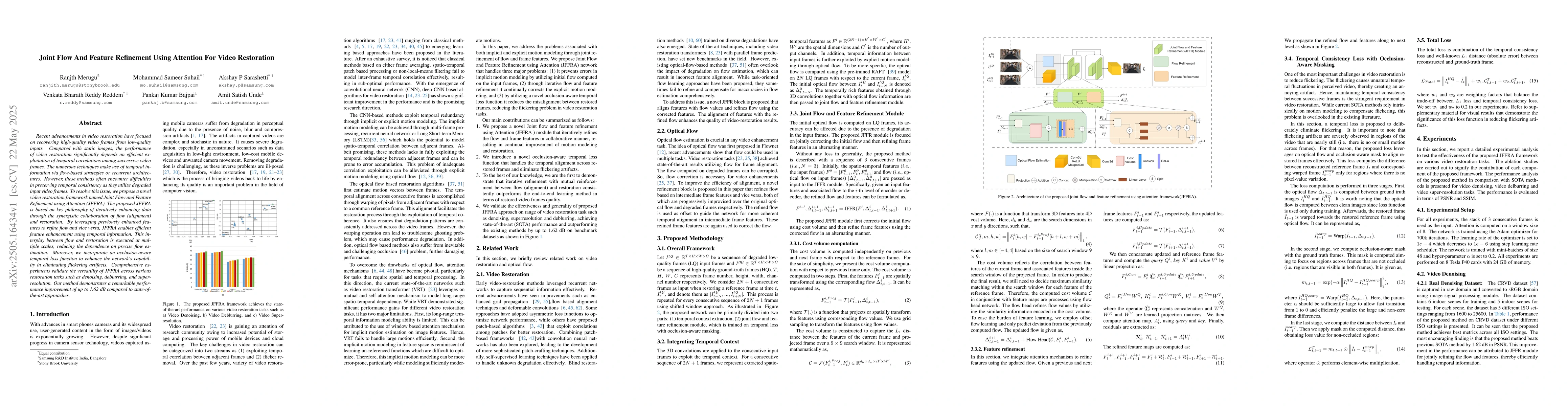A new video restoration framework called Joint Flow and Feature Refinement using Attention (JFFRA) improves performance on tasks like denoising, deblurring, and super-resolution by leveraging temporal correlations between frames.