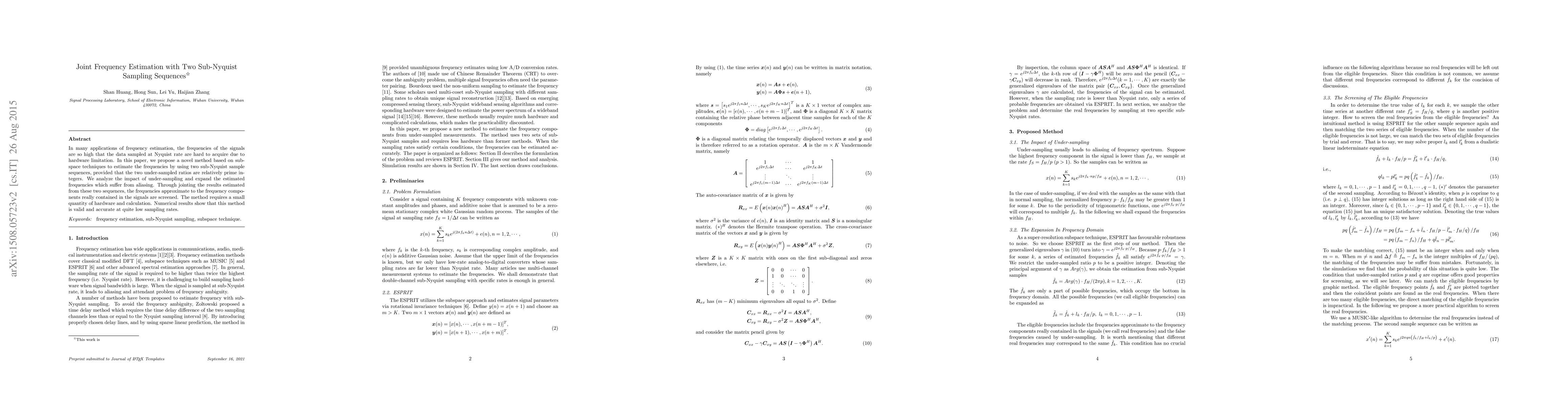 This paper proposes a novel method for frequency estimation using two sub-Nyquist sampling sequences, leveraging subspace techniques to overcome hardware limitations. The method effectively estimates frequencies by combining results from under-sampled sequences, demonstrating accuracy and efficiency at low sampling rates.