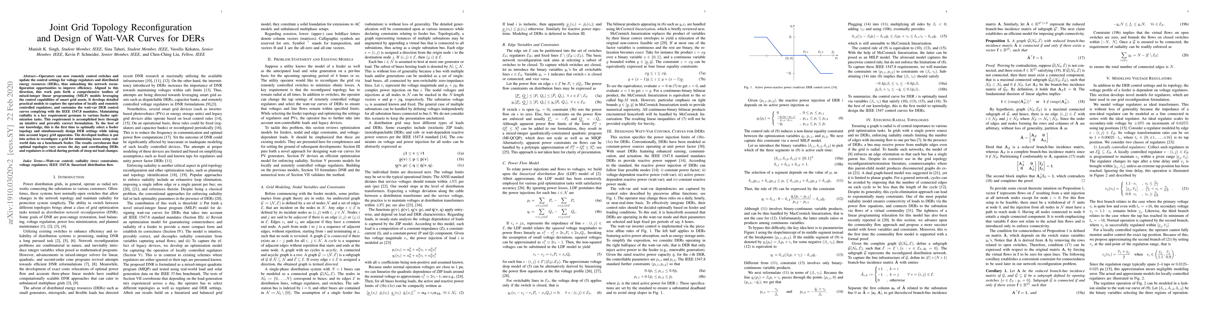 Operators can now remotely control switches and update the control settings for voltage regulators and distributed energy resources (DERs), thus unleashing the network reconfiguration opportunities to improve efficiency. Aligned to this direction, this work puts forth a comprehensive toolbox of optimization models leveraging the control capabilities of smart grid assets. We put forth detailed yet practical models to capture the operation of locally and remotely controlled regulators, and customize the watt-var DER control curves complying with the IEEE 1547.8 mandates. Maintaining radiality is a key requirement germane to various feeder optimization tasks. This requirement is accomplished here through an intuitive and provably correct formulation. The developed toolbox is put into action to reconfigure a grid for minimizing losses using real-world data on a benchmark feeder. The results corroborate that optimal topologies vary across the day and coordinating DERs and regulators is critical during periods of steep net load changes.