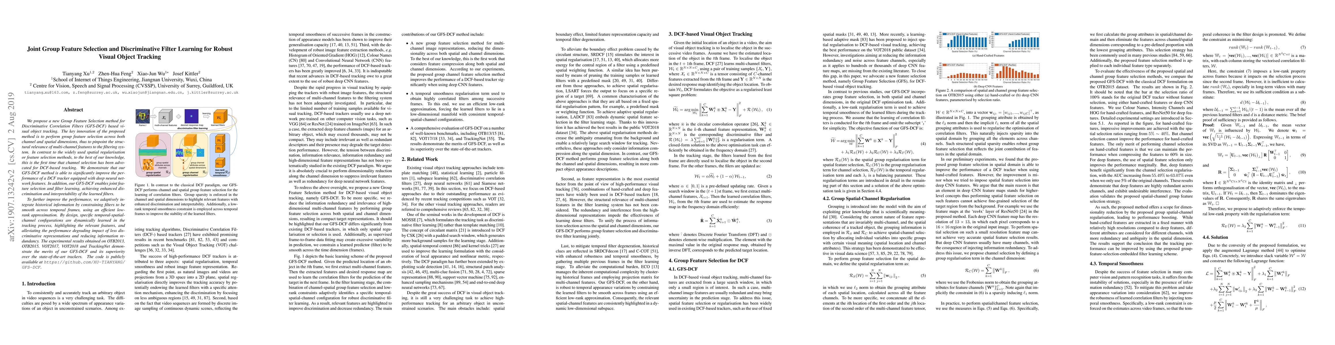 This paper introduces a novel Group Feature Selection method for Discriminative Correlation Filters (GFS-DCF) to enhance visual object tracking. It performs group feature selection across both channel and spatial dimensions, improving the discriminative ability of the tracking system and achieving better performance compared to state-of-the-art trackers.