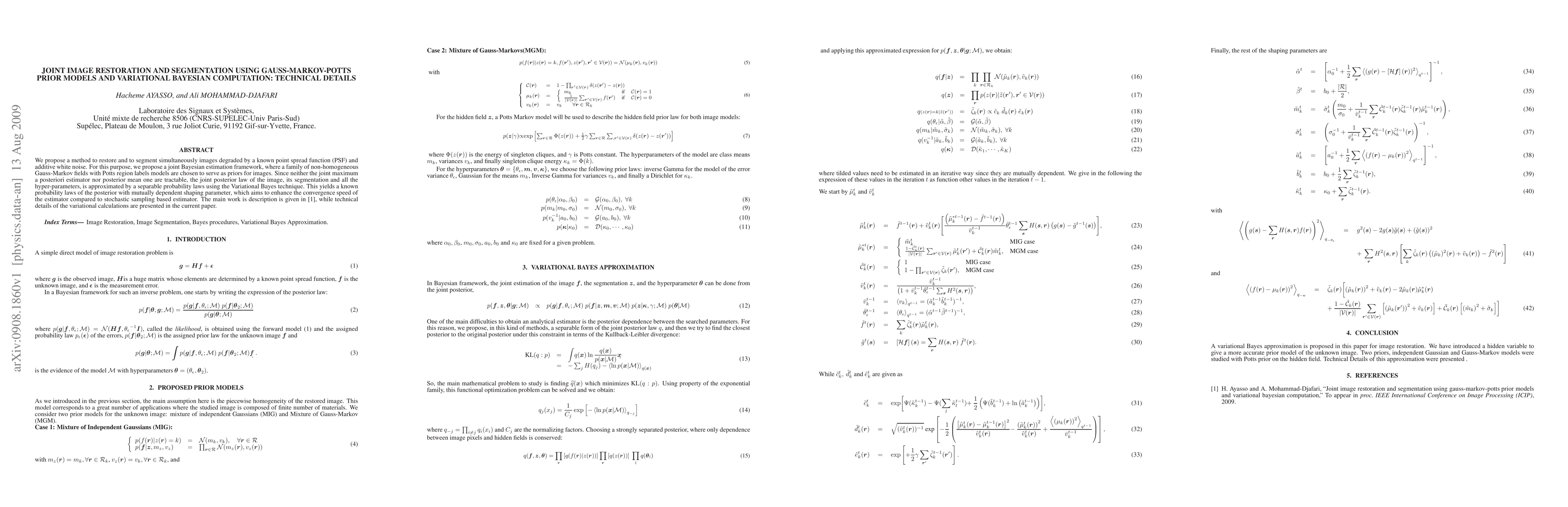We propose a method to restore and to segment simultaneously images degraded by a known point spread function (PSF) and additive white noise. For this purpose, we propose a joint Bayesian estimation framework, where a family of non-homogeneous Gauss-Markov fields with Potts region labels models are chosen to serve as priors for images. Since neither the joint maximum a posteriori estimator nor posterior mean one are tractable, the joint posterior law of the image, its segmentation and all the hyper-parameters, is approximated by a separable probability laws using the Variational Bayes technique. This yields a known probability laws of the posterior with mutually dependent shaping parameter, which aims to enhance the convergence speed of the estimator compared to stochastic sampling based estimator. The main work is description is given in [1], while technical details of the variational calculations are presented in the current paper.